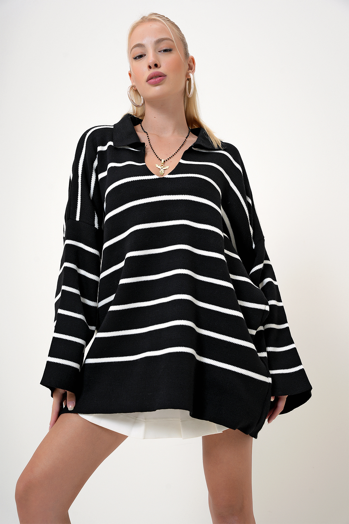 Kadın Krem Bisiklet Yaka Önü Gold Düğmeli Çizgili Triko Kışlık Kazak PRM1090 Kadın Krem Bisiklet Yaka Önü Gold Düğmeli Çizgili Triko Kışlık Kazak PRM1090 Standart