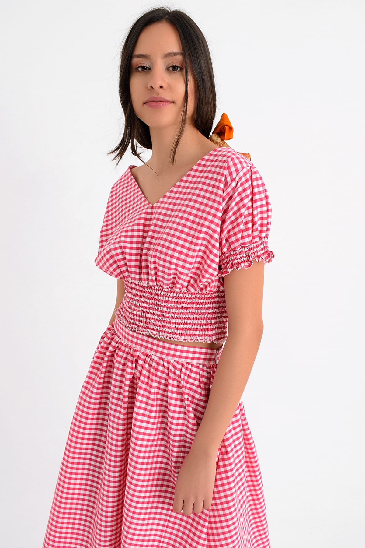 Kadın Önden Bağlamalı Bebe Dantel Yaka Pötikare Desenli Bluz Kadın Önden Bağlamalı Bebe Dantel Yaka Pötikare Desenli Bluz F1714 L