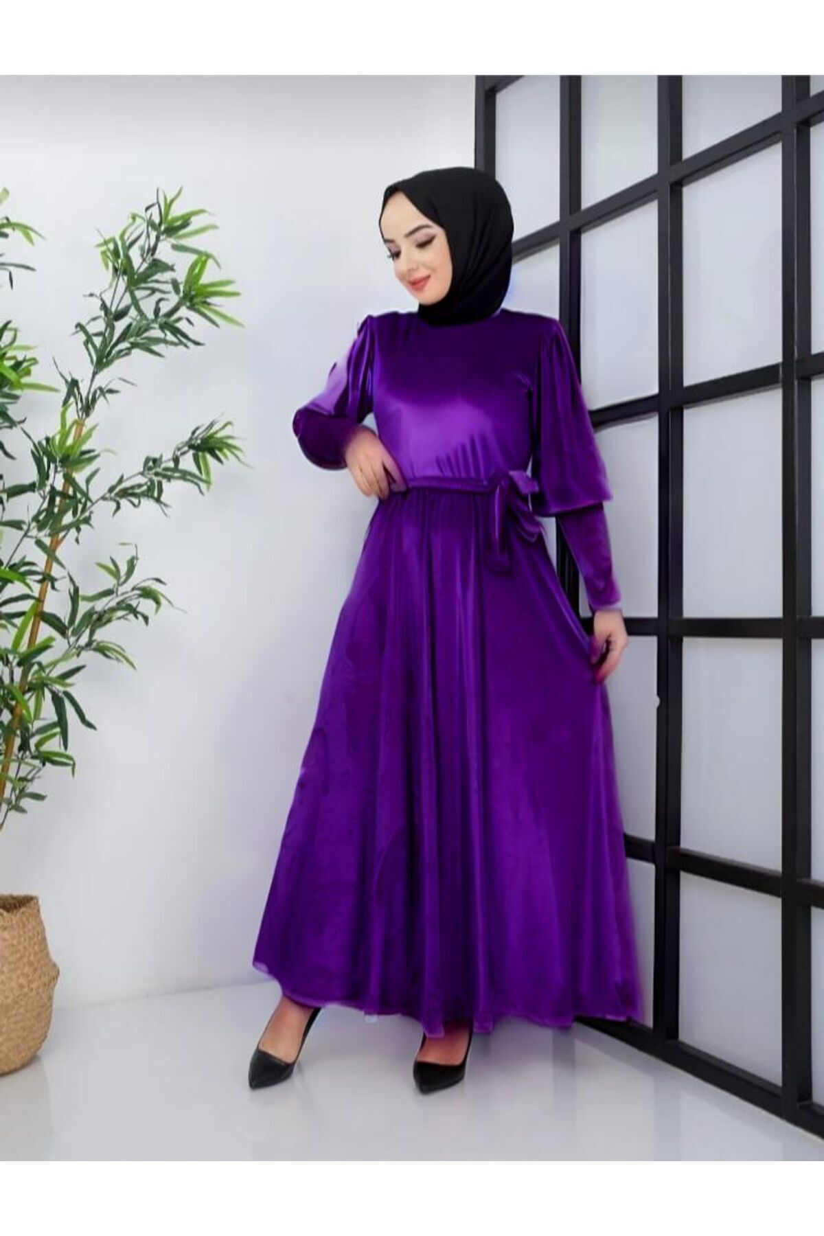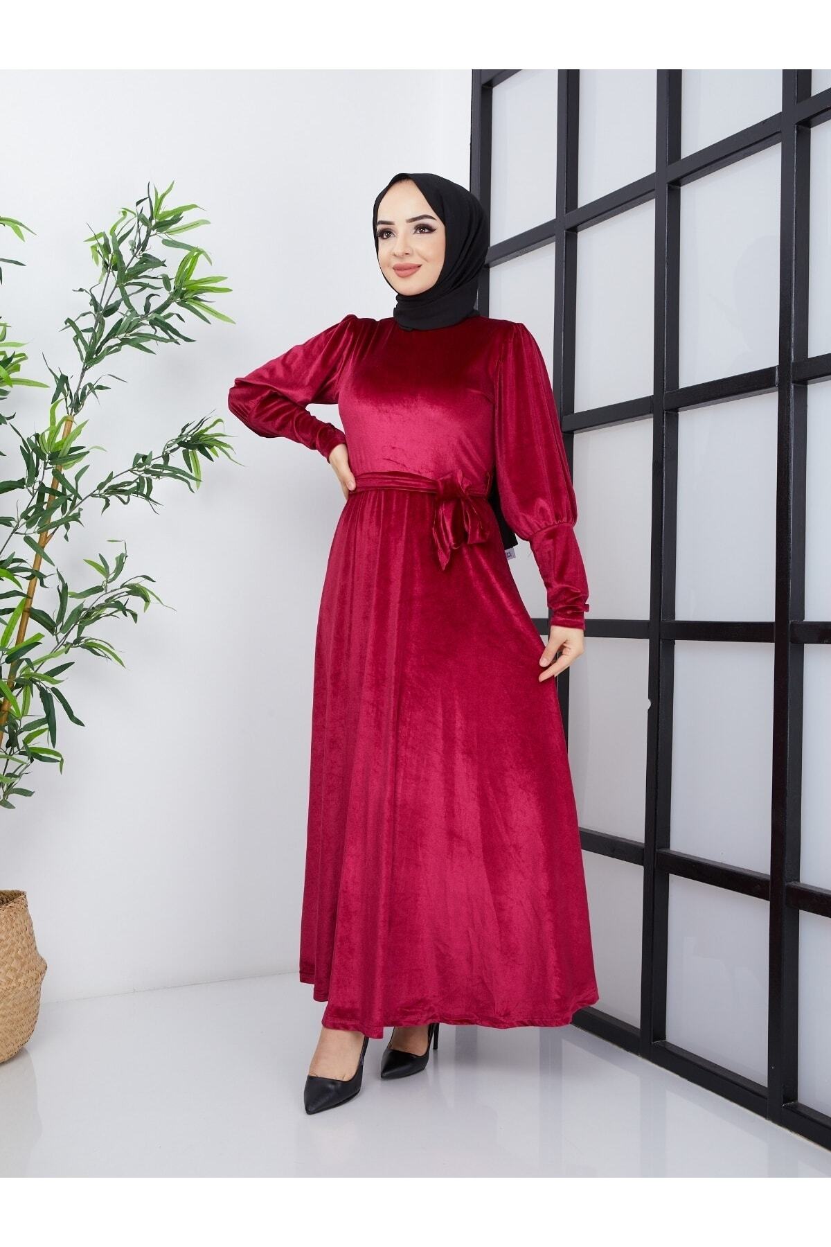 Kadın Balon Kol Kuşaklı Belden Oturtmalı Kadife Kumaş Elbise Kadın Balon Kol Kuşaklı Belden Oturtmalı Kadife Kumaş Elbise Eck5115 46