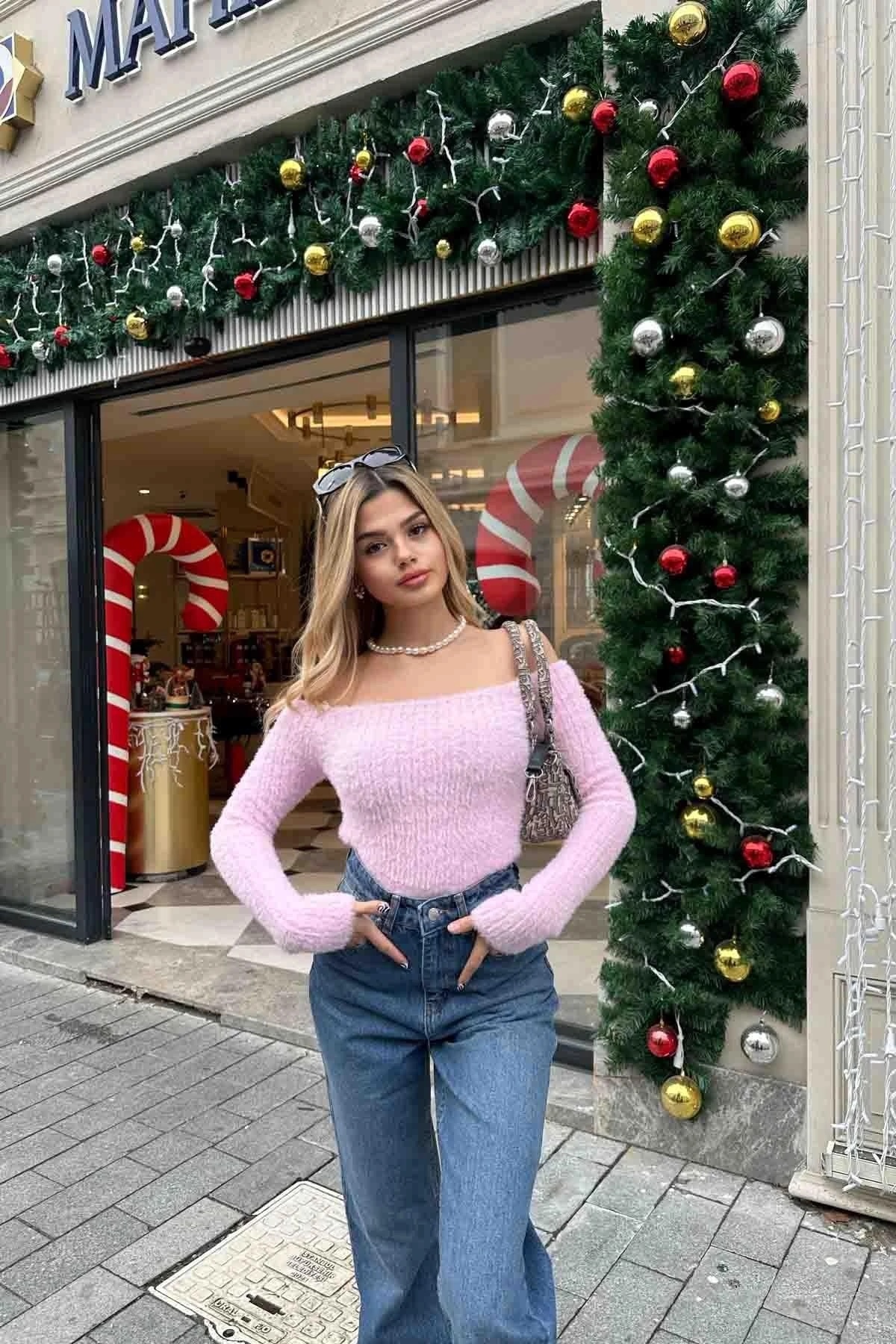 Kadın Pembe Kayık Yaka Triko Yumoş Kazak Kadın Pembe Kayık Yaka Triko Yumoş Kazak LSN087 Standart