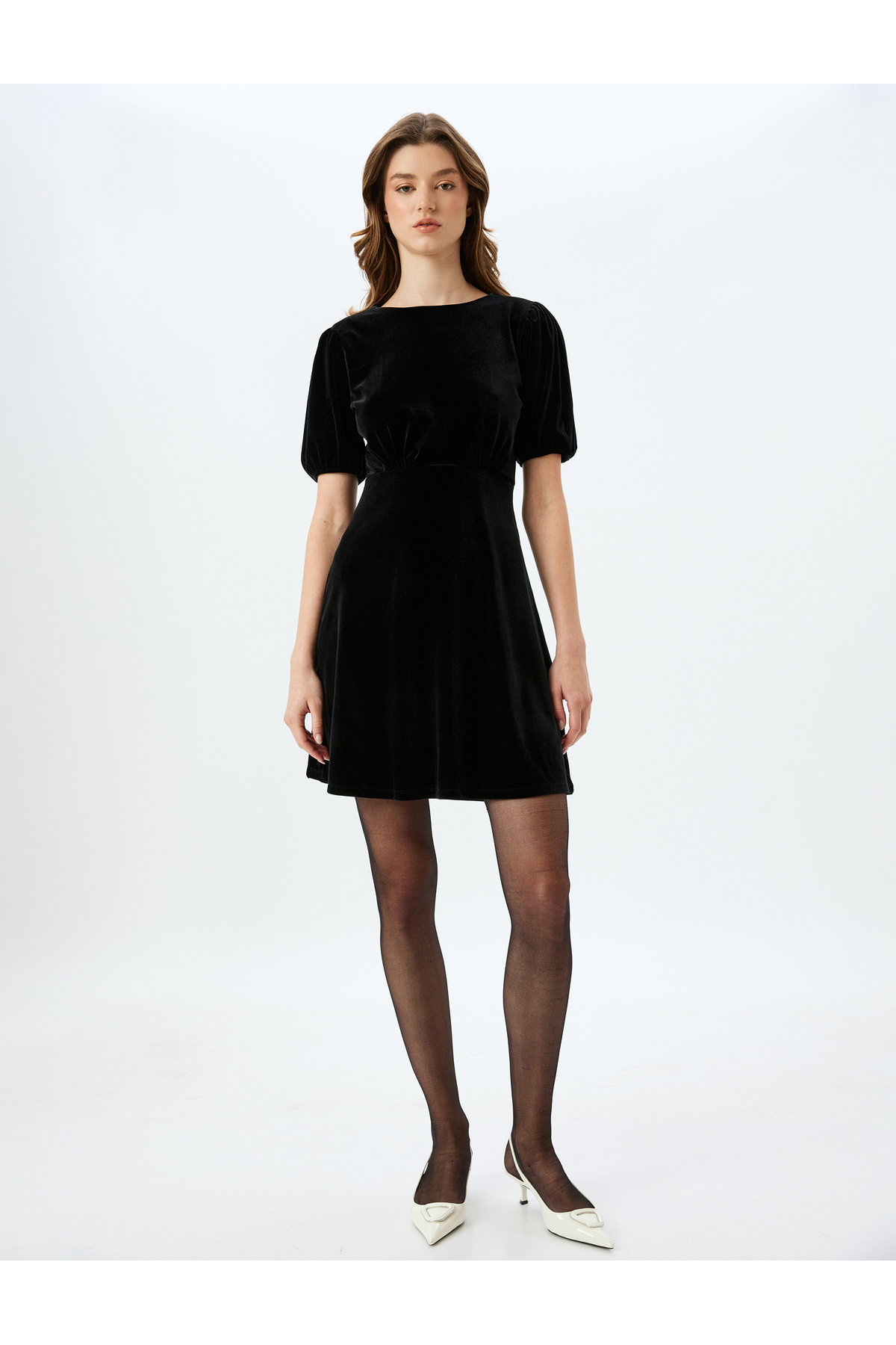 Yuvarlak Yaka Kısa Balon Kol Mini Kadife Elbise Yuvarlak Yaka Kısa Balon Kol Mini Kadife Elbise 5WAK80002EK XL