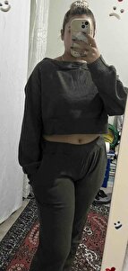 Kadın Haki İnterlok Kumaş Madonna Yaka Crop Sweat Ve Paçası Lastikli Pantolon Takım ALC-X13075 Kadın Haki İnterlok Kumaş Madonna Yaka Crop Sweat Ve Paçası Lastikli Pantolon Takım ALC-X13075 L