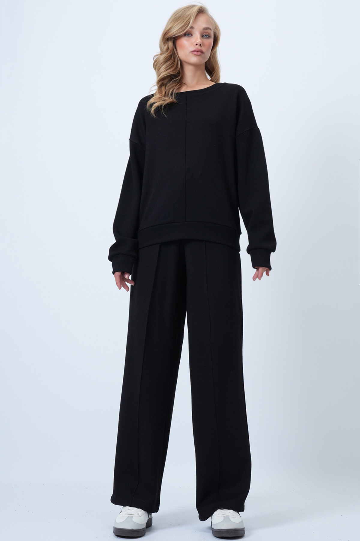 Kadın Siyah V Yaka Çıtçıt Detaylı Bürümcük Bluz Ve Geniş Paça Pantolon Takım ALC-X13072 Kadın Siyah V Yaka Çıtçıt Detaylı Bürümcük Bluz Ve Geniş Paça Pantolon Takım ALC-X13072 L