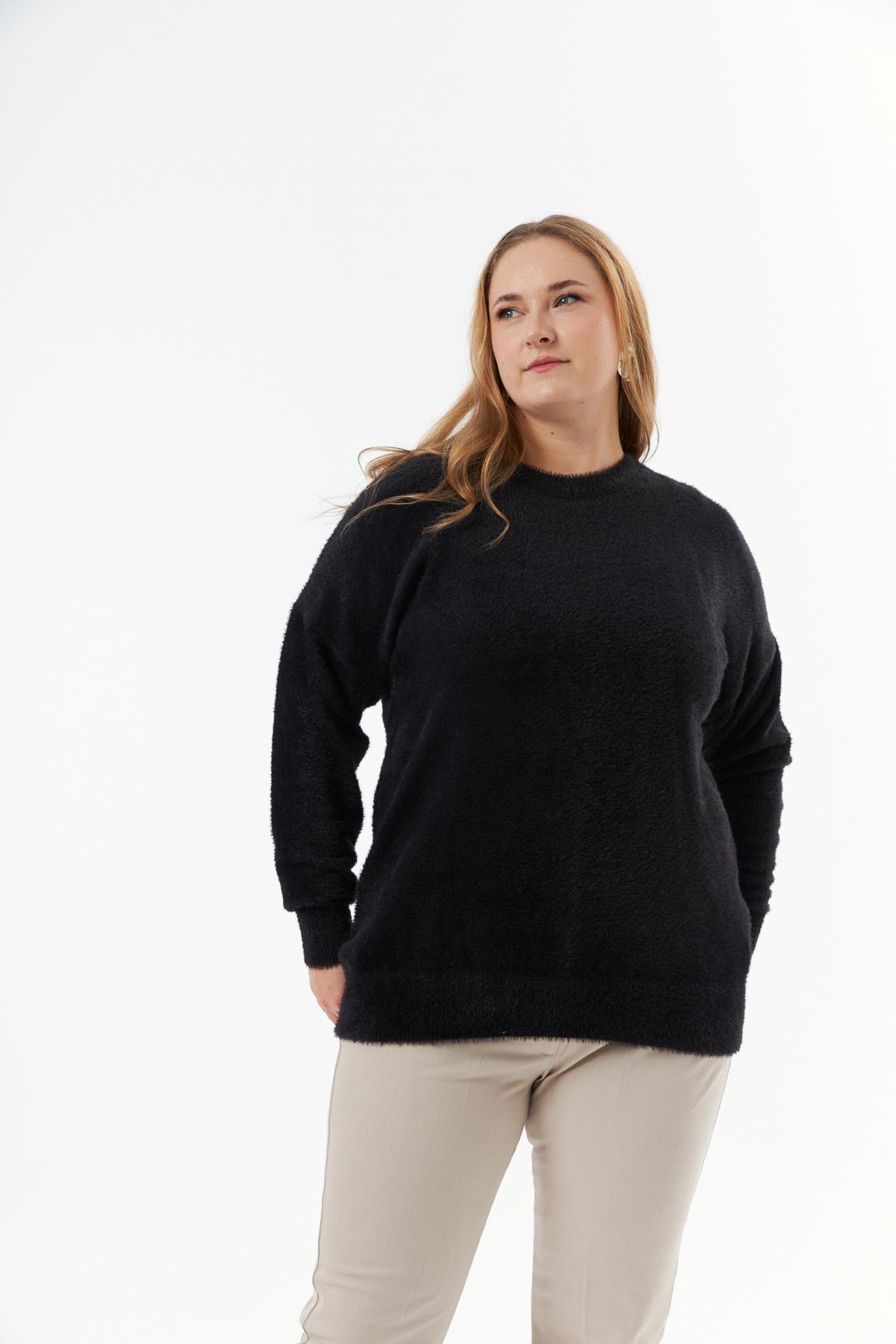 Büyük Beden Kaşmir Karışımlı Sakallı Triko Kazak Siyah Büyük Beden Kaşmir Karışımlı Sakallı Triko Kazak Siyah o6517 48-50