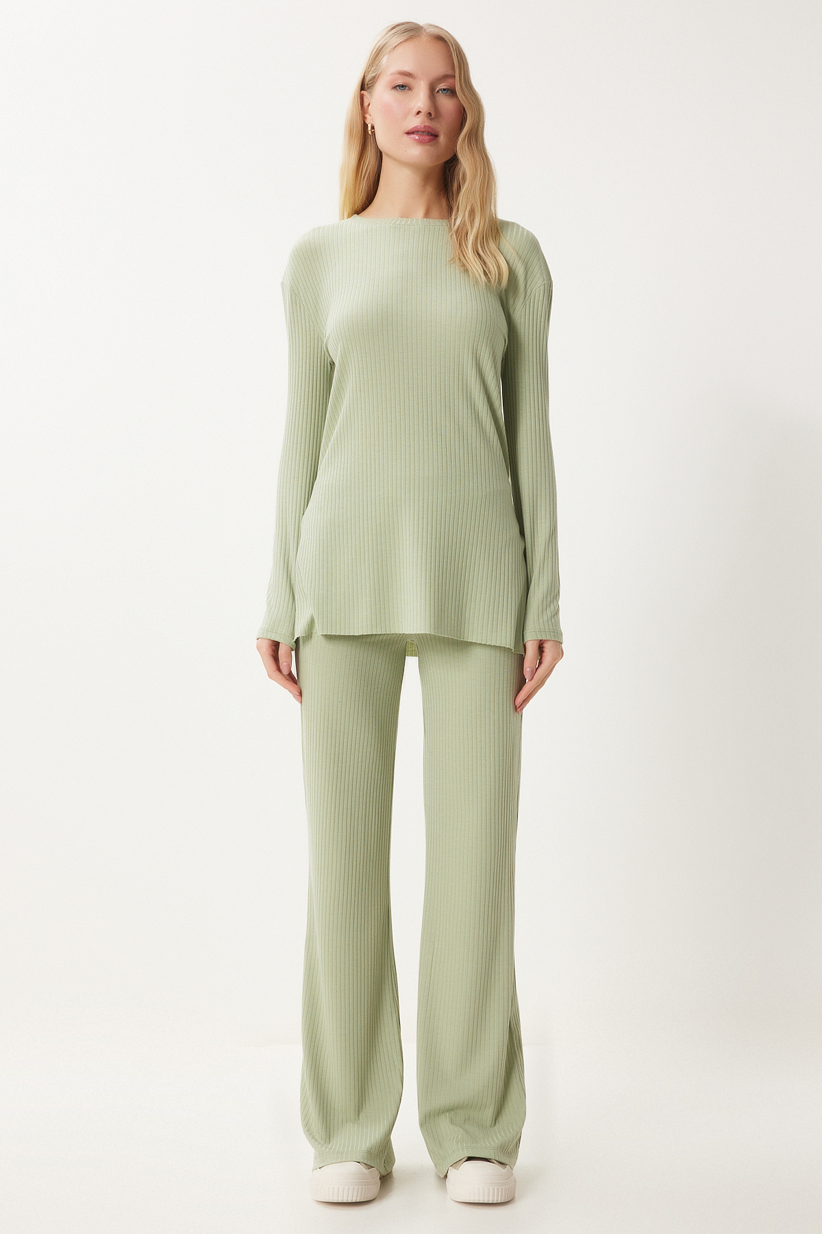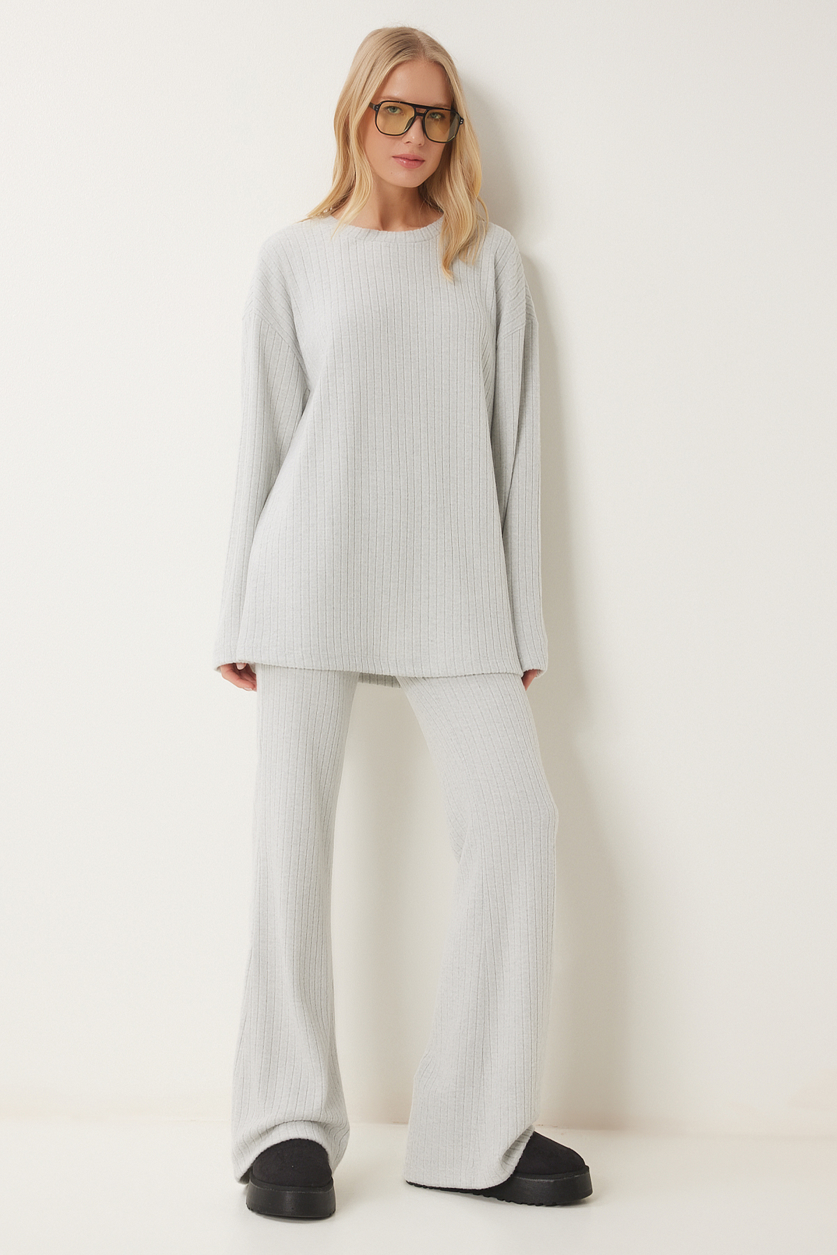 Kadın Lacivert Rahat Fitilli Örme Bluz Pantolon Takım OW00054 Kadın Lacivert Rahat Fitilli Örme Bluz Pantolon Takım OW00054 42
