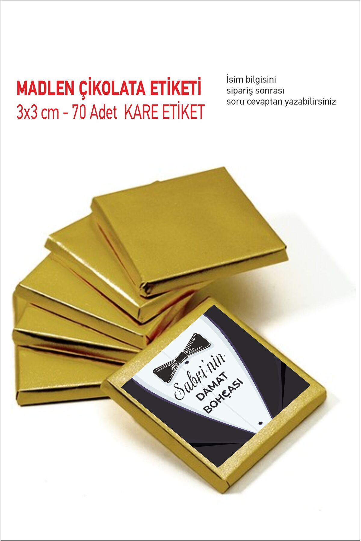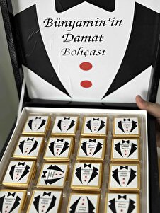 - Diğer Özellikler : Damat Bohça Çikolata Etiketi 3,5 cm*3,5 cm: 96 ADET ÇİKOLATA ETİKETİ 21 cm*29 cm : 1 ADET KUTU ETİKETİ İsim bilgisini sipariş sonrası soru cevap kısmından yazabilirsiniz