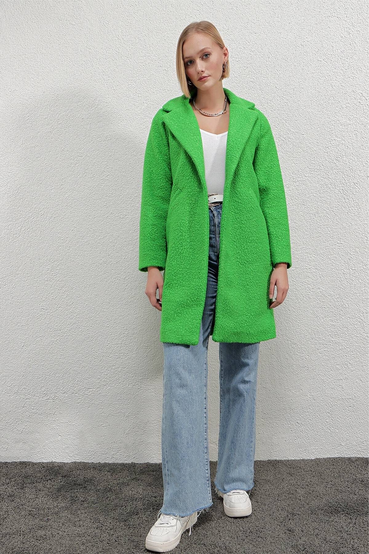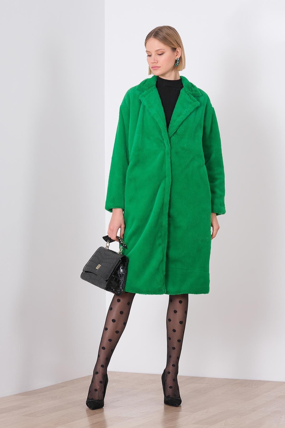 Kadın Çimen Yeşili Düğmeli Kanguru Cepli Uzun Star Kaban 70569 Kadın Çimen Yeşili Düğmeli Kanguru Cepli Uzun Star Kaban 70569 M/L