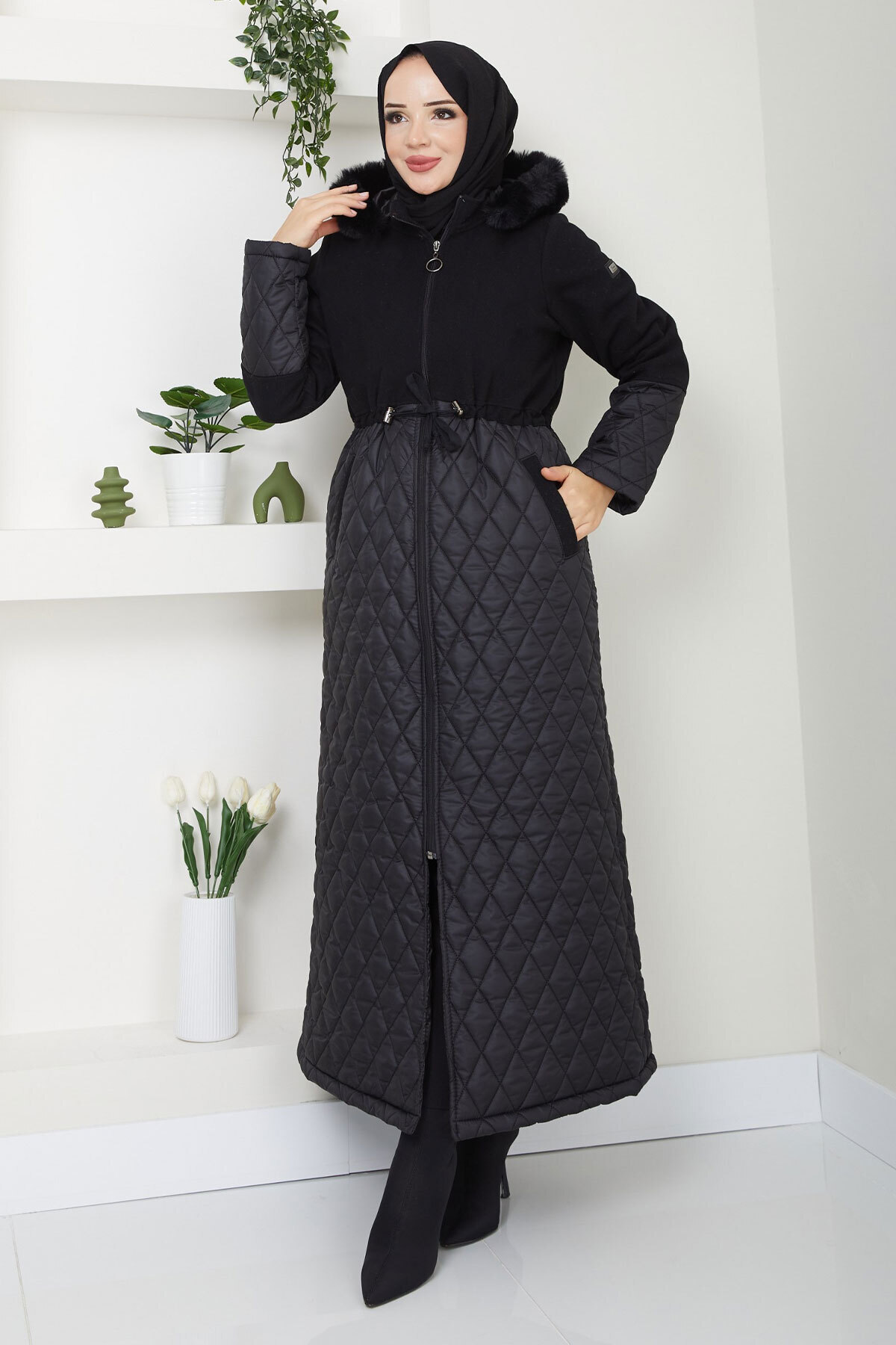 Kadın Büyük Beden Siyah Kapüşonlu Kemerli Fermuarlı Kapitone Mont Kadın Büyük Beden Siyah Kapüşonlu Kemerli Fermuarlı Kapitone Mont 2580 52