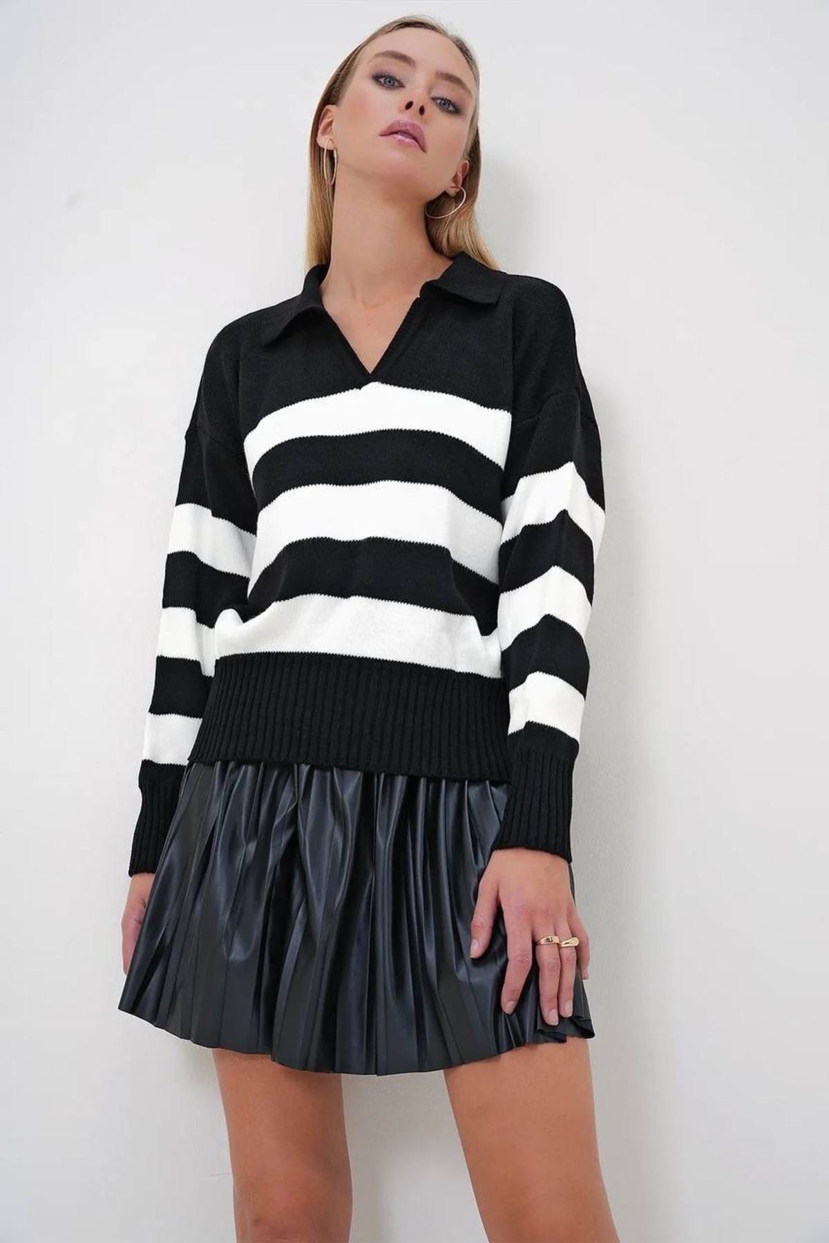 Kadın Çizgili Oversize Gömlek Yaka Triko Kazak Kadın Çizgili Oversize Gömlek Yaka Triko Kazak 2488 Standart