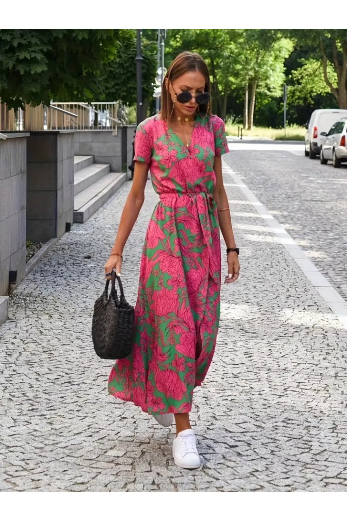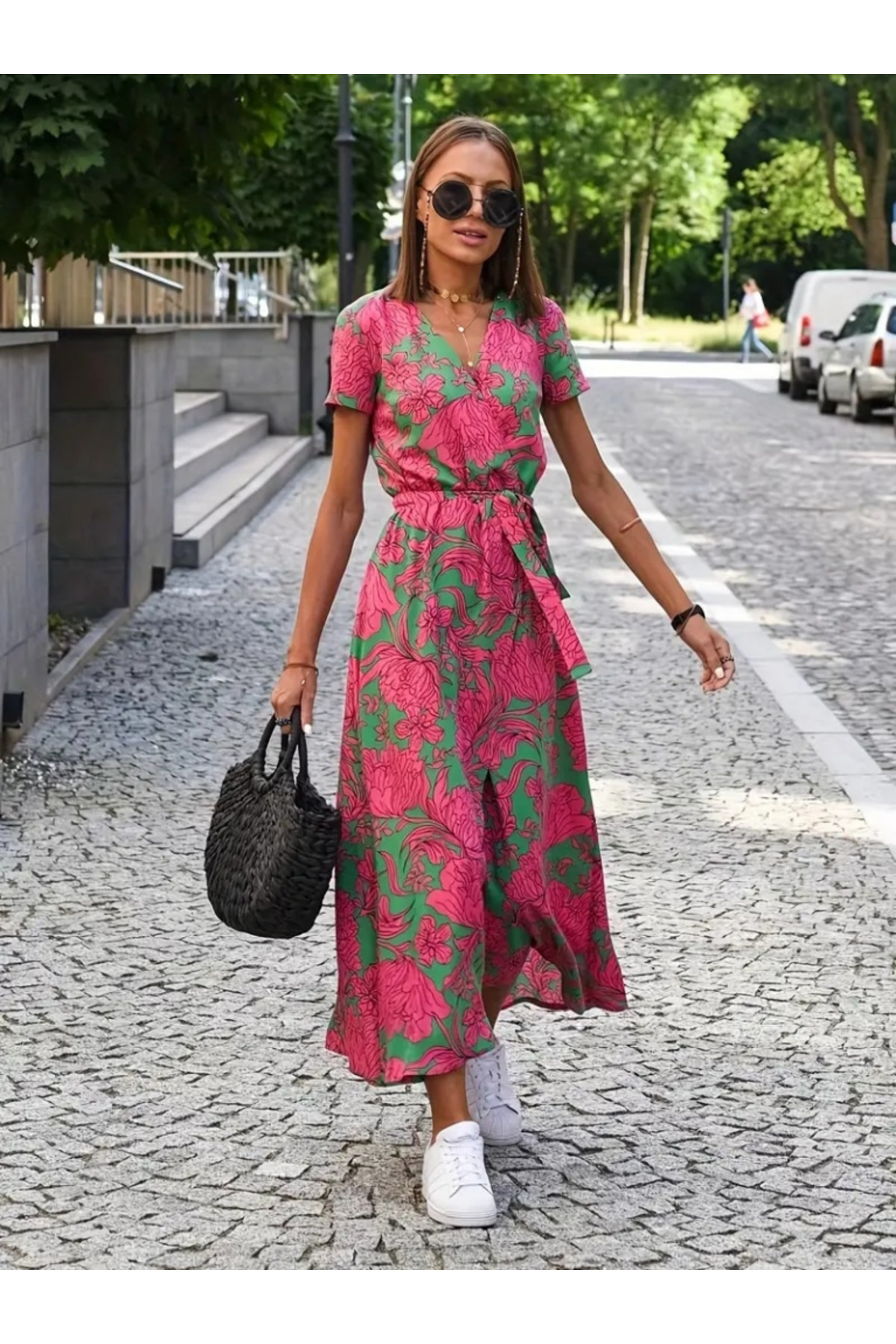 Kısa Kollu Kruvaze Yaka Beli Kuşaklı Çiçek Desen Midi Boy Süprem Elbise - Pembe Kısa Kollu Kruvaze Yaka Beli Kuşaklı Çiçek Desen Midi Boy Süprem Elbise - Pembe JAN13685 2XL-3XL