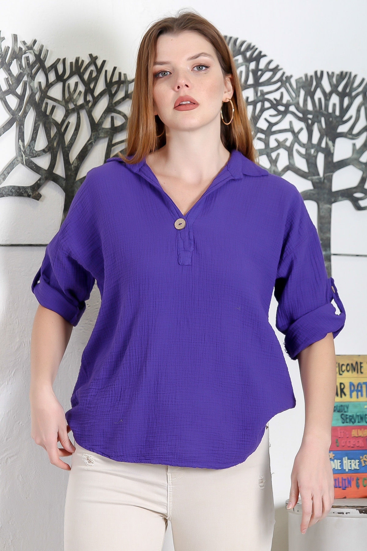 Mor Gömlek Yaka Düğmeli 3/4 Kol Düğmeli Casual Müslin Dokuma Bluz Mor Gömlek Yaka Düğmeli 3/4 Kol Düğmeli Casual Müslin Dokuma Bluz M10010200BL91798 XL
