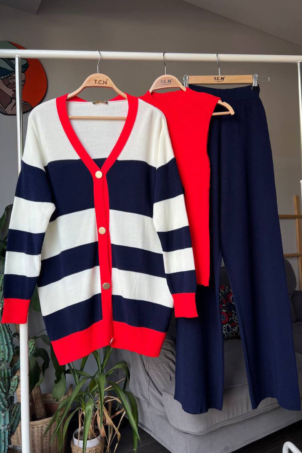 Kadın Mavi Çizgili Standart Beden Triko Hırka Bluz Pantolon Alt-üst Içlikli Üçlü Takım Kadın Mavi Çizgili Standart Beden Triko Hırka Bluz Pantolon Alt-üst Içlikli Üçlü Takım 3276 تک سایز