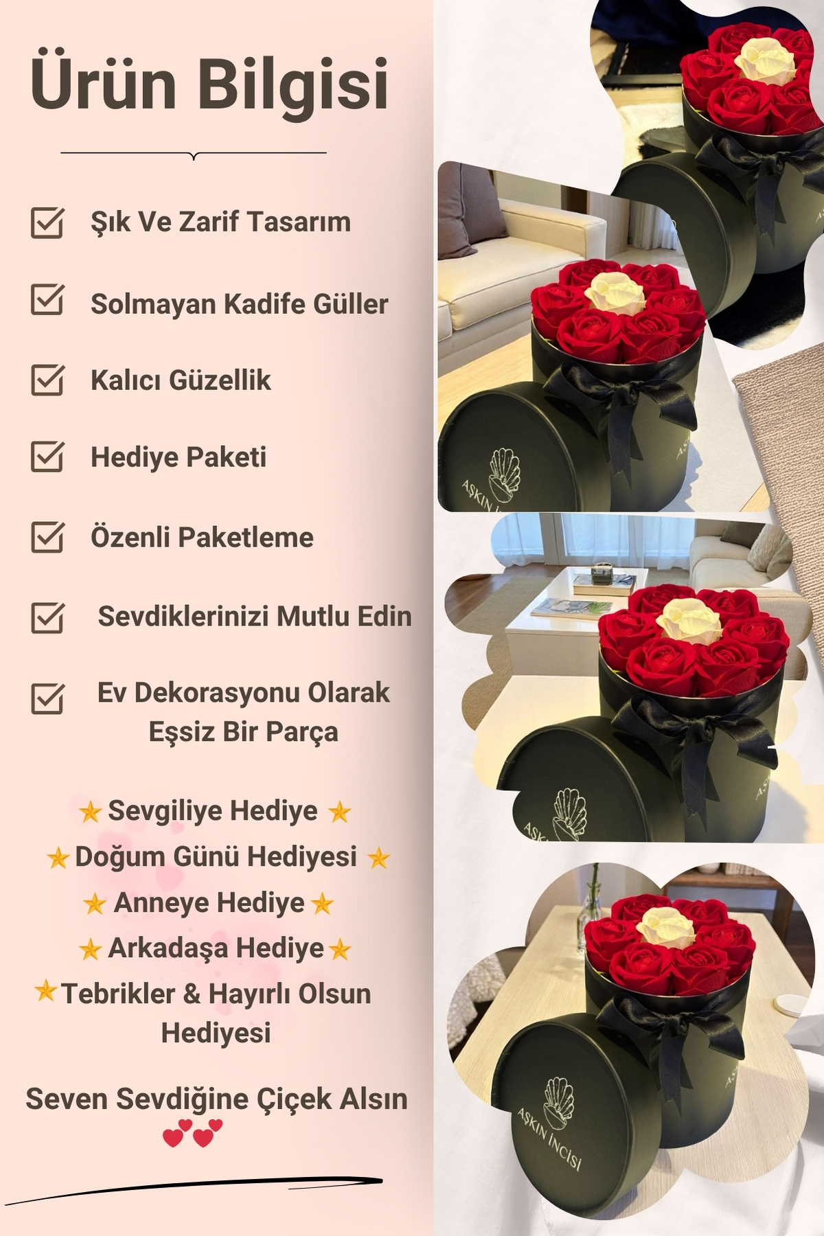 - Diğer Özellikler : Sevgiliye Hediye Kutuda Yapay Gül Solmayan Yapay Çiçek Evlilik Yıldönümü Buketi Anneye Doğum Günü Hediyelik Kutu Kız Arkadaşa Konsept Hediyelik Hediyelik Ürünler Nişan Söz Kişiye Özel Gelin Babaya İsteme Kız Kardeşe Kırmızı Beyaz Mavi Siyah Gül