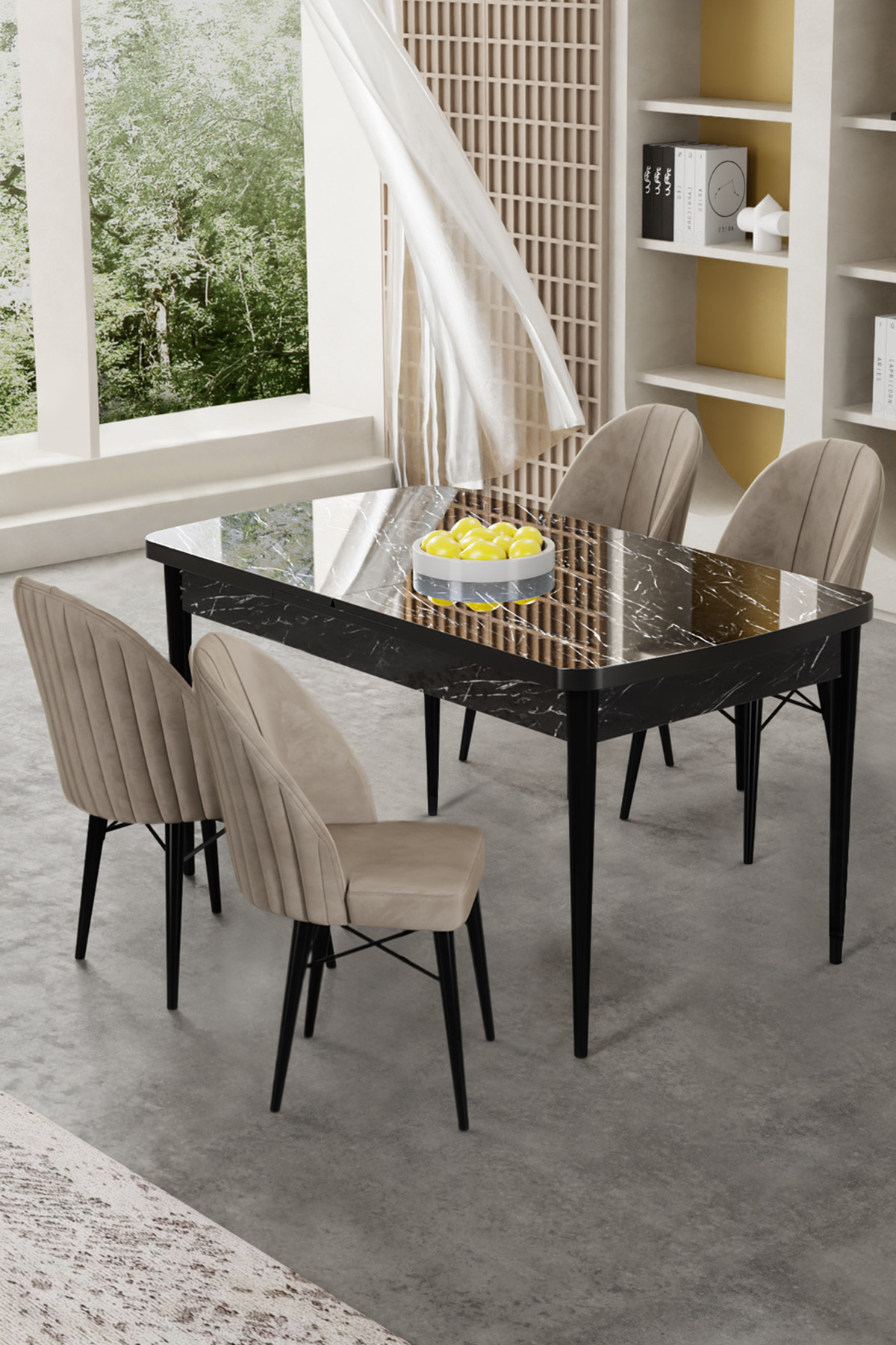 Gale Serisi 80x132 Açılabilir Lak Panel Siyah Mermer Desen Mutfak Masa Takımı 6 Antrasit Sandalye Gale Serisi 80x132 Açılabilir Lak Panel Siyah Mermer Desen Mutfak Masa Takımı 6 Antrasit Sandalye 22GALE06SYHMR تک سایز