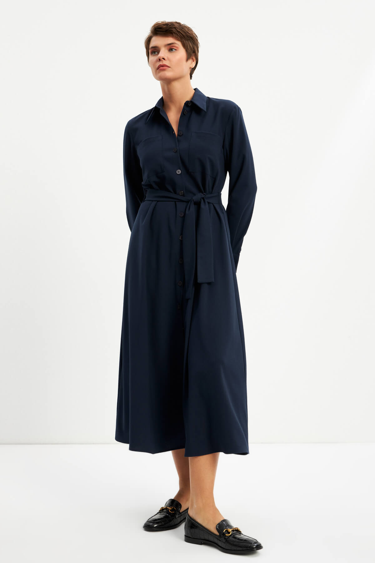 Lacivert Kuşaklı Midi Gömlek Elbise Lacivert Kuşaklı Midi Gömlek Elbise SPN24-291 50