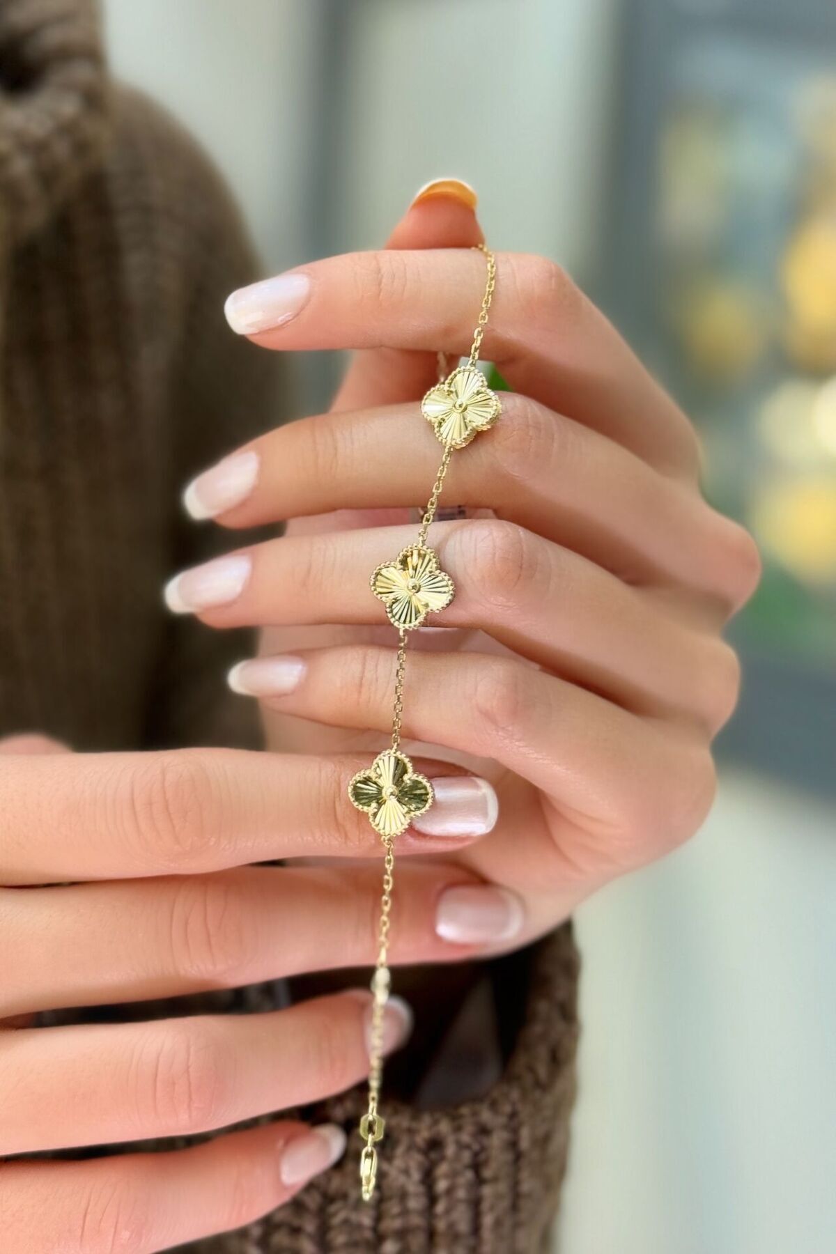 14 Ayar Altın Işıltılı Beşli Yonca Bileklik 14 Ayar Altın Işıltılı Beşli Yonca Bileklik BLK17413 تک سایز