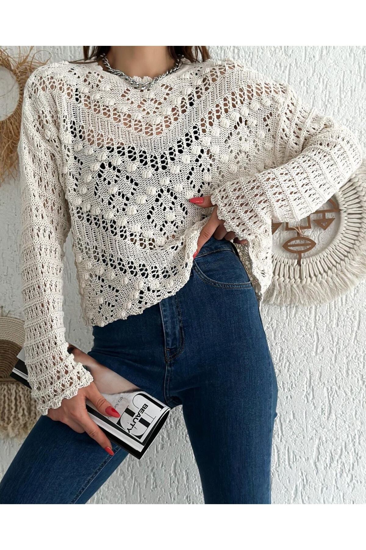 Kadın Krem Bisiklet Yaka Ajurlu Triko Kalın Kazak ALC-X13208 Kadın Krem Bisiklet Yaka Ajurlu Triko Kalın Kazak ALC-X13208 L