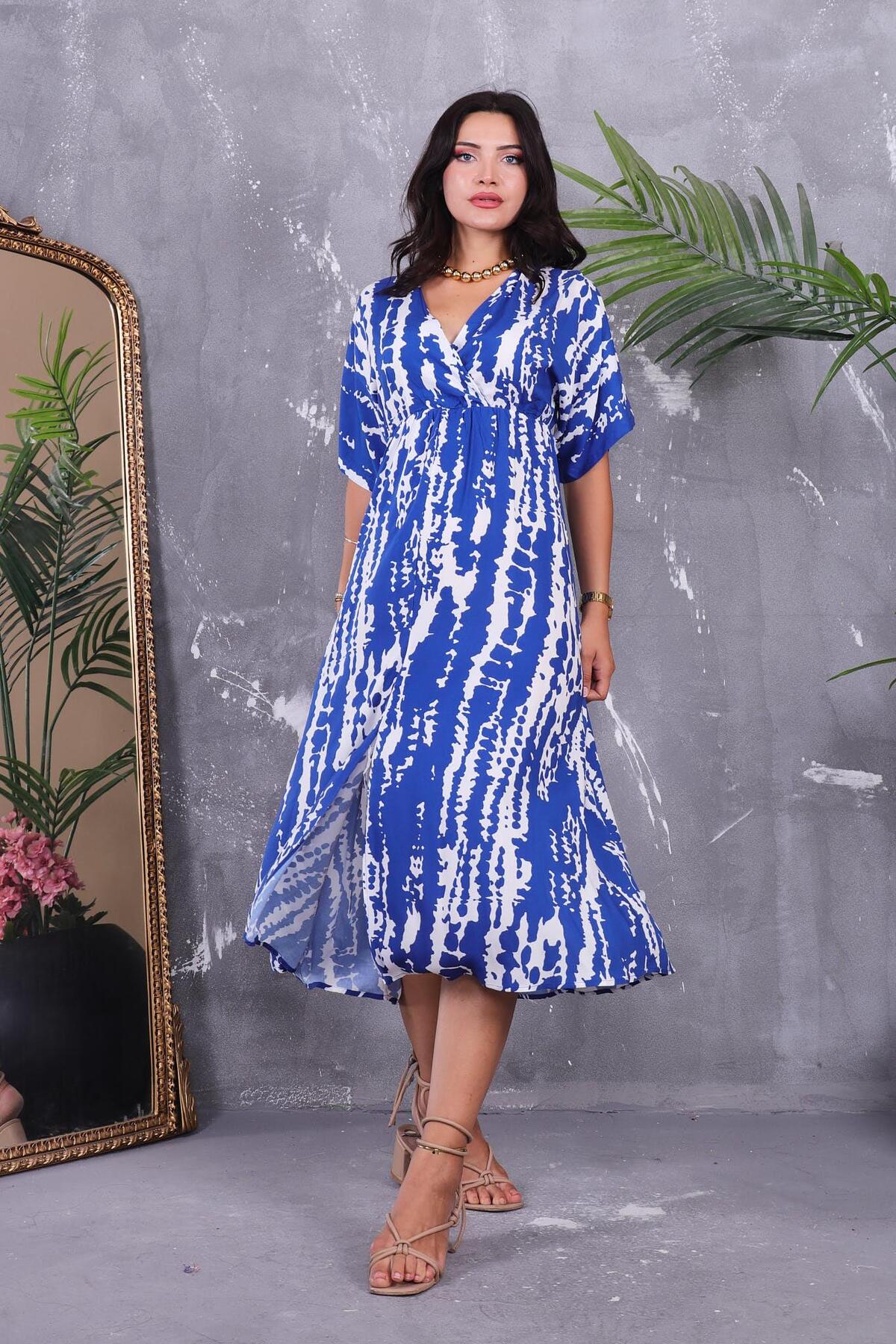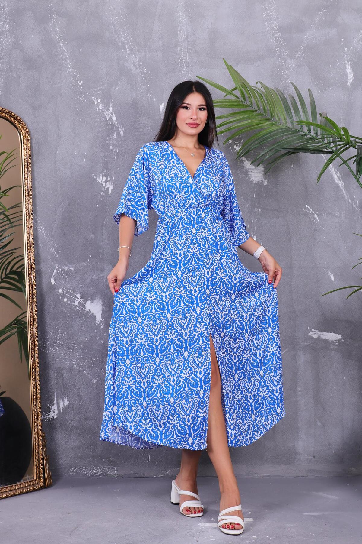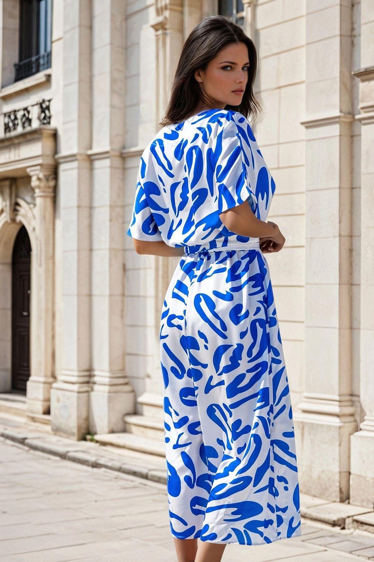 Mavi Beyaz Desenli, V Yaka, Kuşak Detaylı, Uzun Elbise Mavi Beyaz Desenli, V Yaka, Kuşak Detaylı, Uzun Elbise AI-3246 42