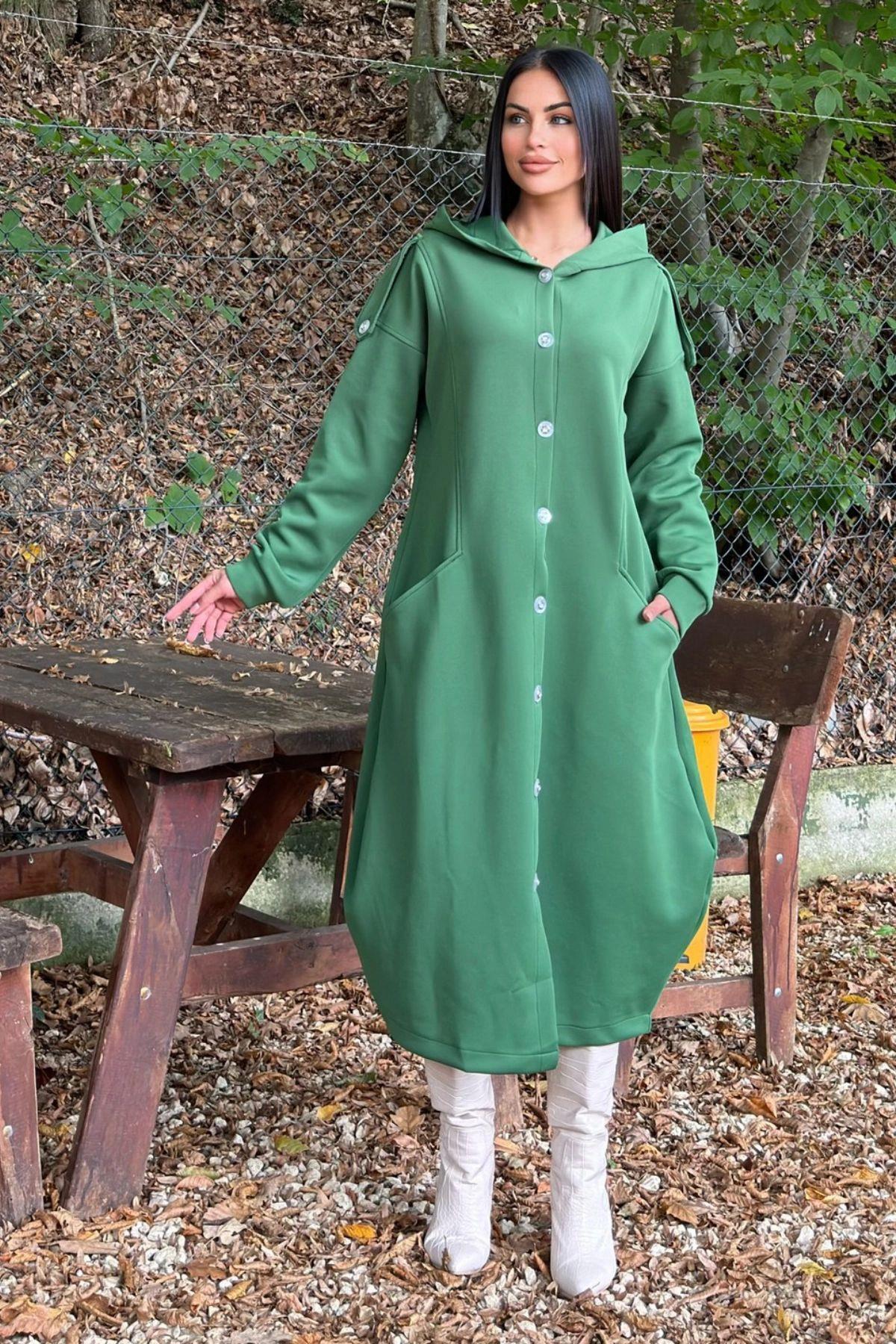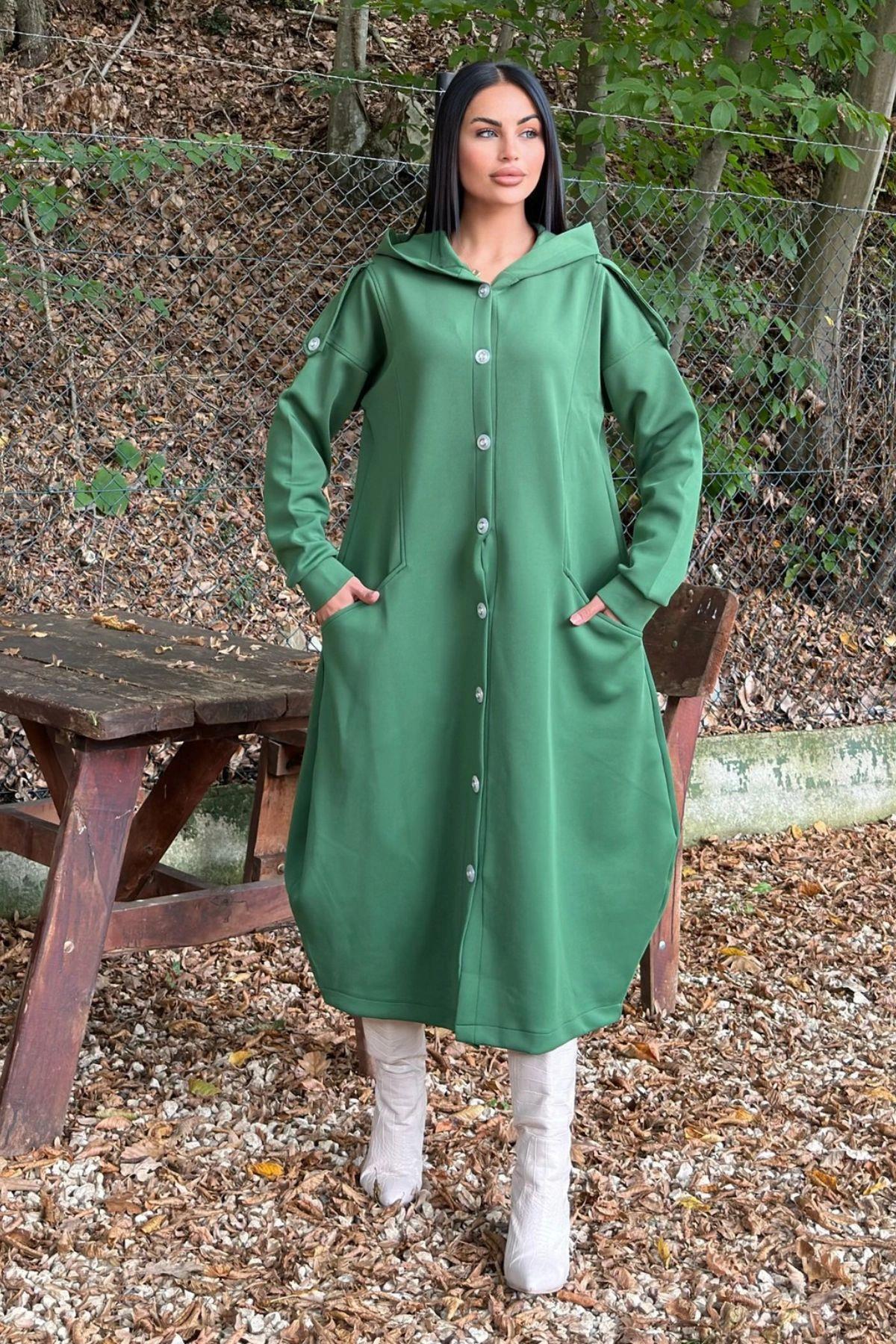Zümrüt Yeşil Kapüşonlu, Uzun Kol, Düğme Detaylı, Eteği Oval, Cepli, Uzun Oversize Salaş Elbise Zümrüt Yeşil Kapüşonlu, Uzun Kol, Düğme Detaylı, Eteği Oval, Cepli, Uzun Oversize Salaş Elbise TYCF866ED1DE23CC00 42