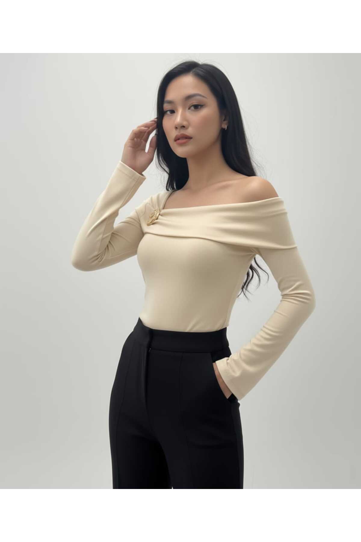 Asimetrik Madonna Yaka Omuz Yan Büzmeli Şerit Detaylı V Yakalı Uzun Kol Sandy Crop Bluz Asimetrik Madonna Yaka Omuz Yan Büzmeli Şerit Detaylı V Yakalı Uzun Kol Sandy Crop Bluz aytenli0056 L