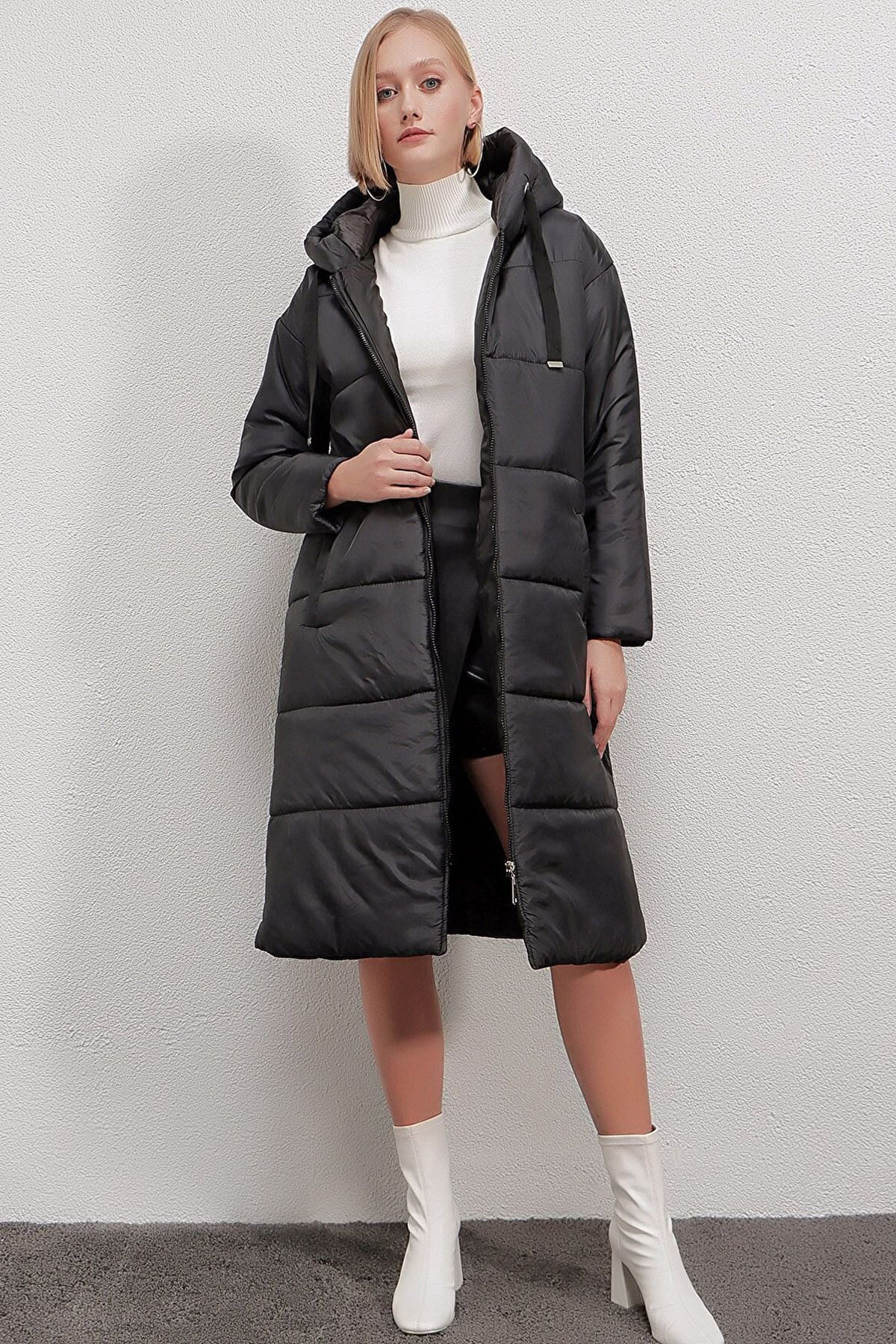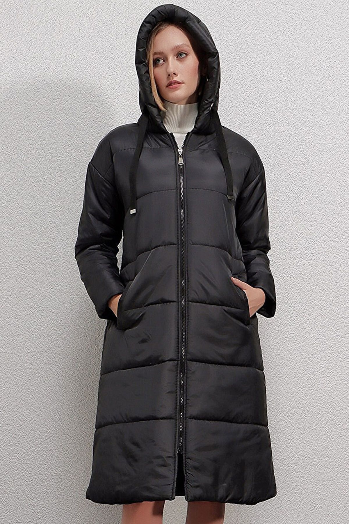 Kadın Kapüşonlu İpli Cepli Fermuarlı Elyaf Dolgulu Uzun Diz Altı Boy Şişme Mont Kadın Kapüşonlu İpli Cepli Fermuarlı Elyaf Dolgulu Uzun Diz Altı Boy Şişme Mont VIVI-1442 42