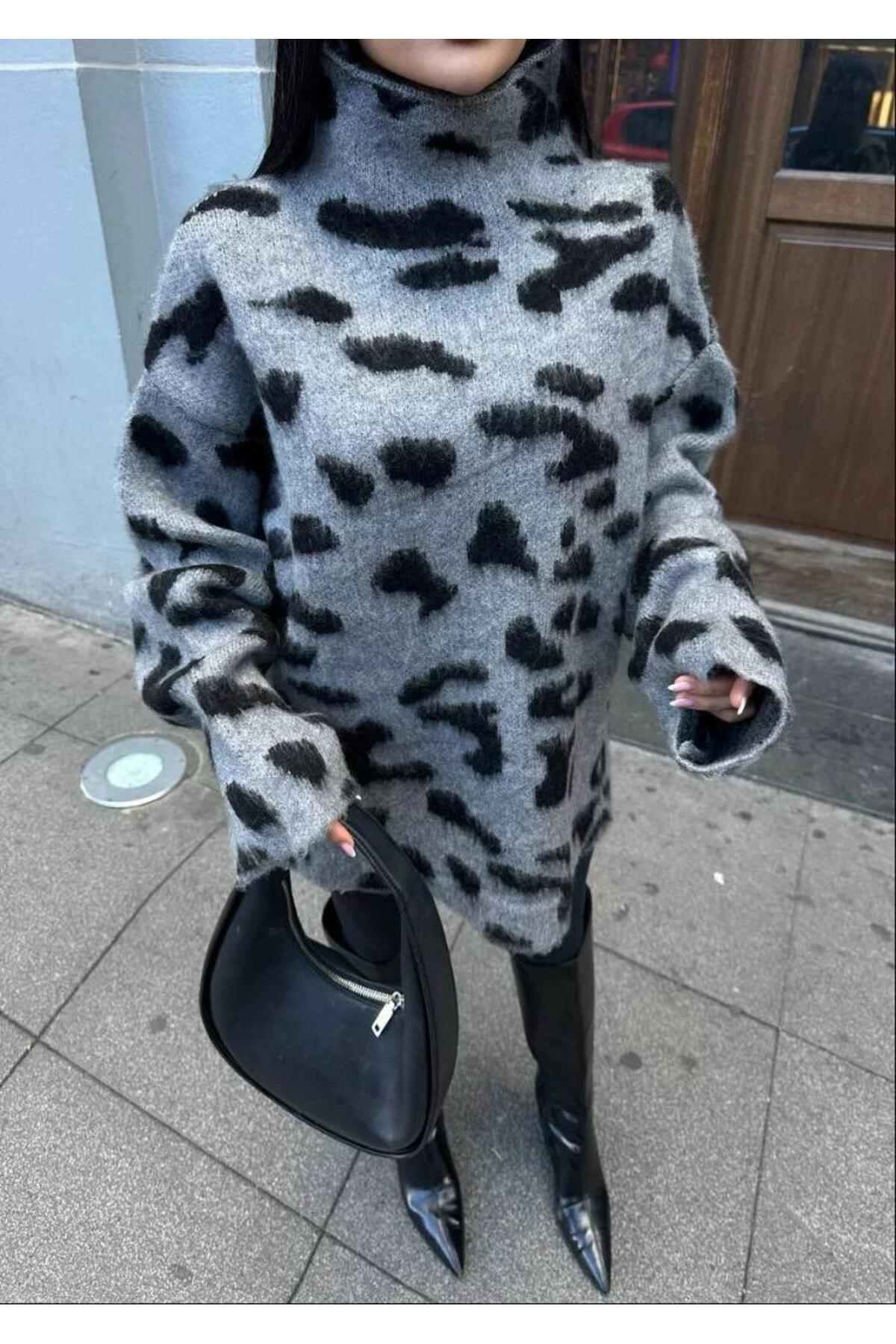 Oversize Leopar Desen Balıkçı Yaka Kahverengi Triko Kadın Kazak Oversize Leopar Desen Balıkçı Yaka Kahverengi Triko Kadın Kazak leopar L