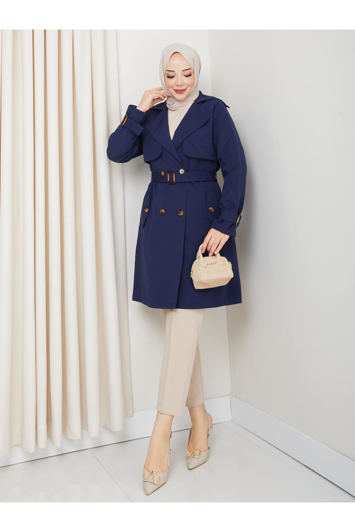 Kadın Degaje Kuşaklı Yarım Boy Astarlı Uzun Kollu Döğmeli TrençKot Lacivert Kadın Degaje Kuşaklı Yarım Boy Astarlı Uzun Kollu Döğmeli TrençKot Lacivert TU23 48