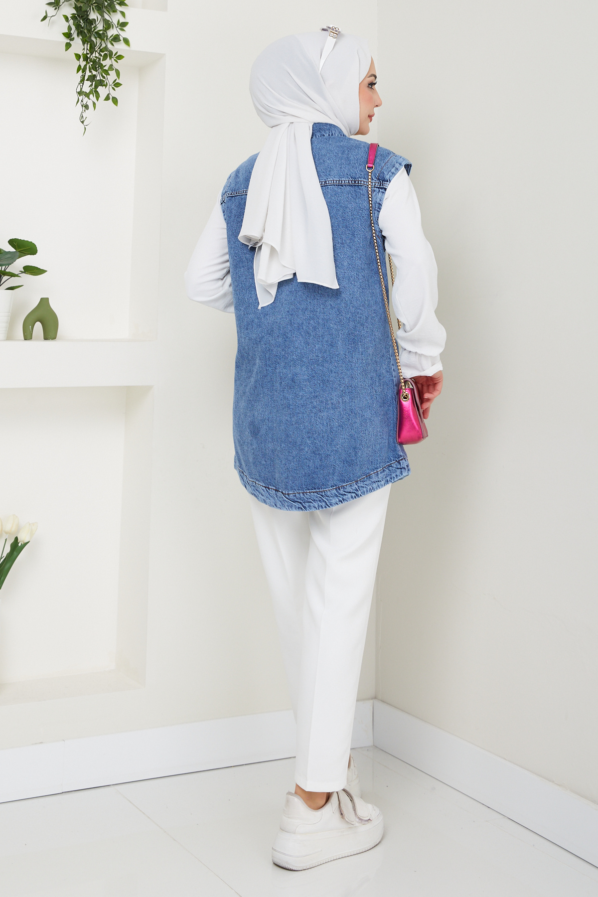 Kadın Mavi Denim Cepli Kot Yelek Kadın Mavi Denim Cepli Kot Yelek pmk359 XL