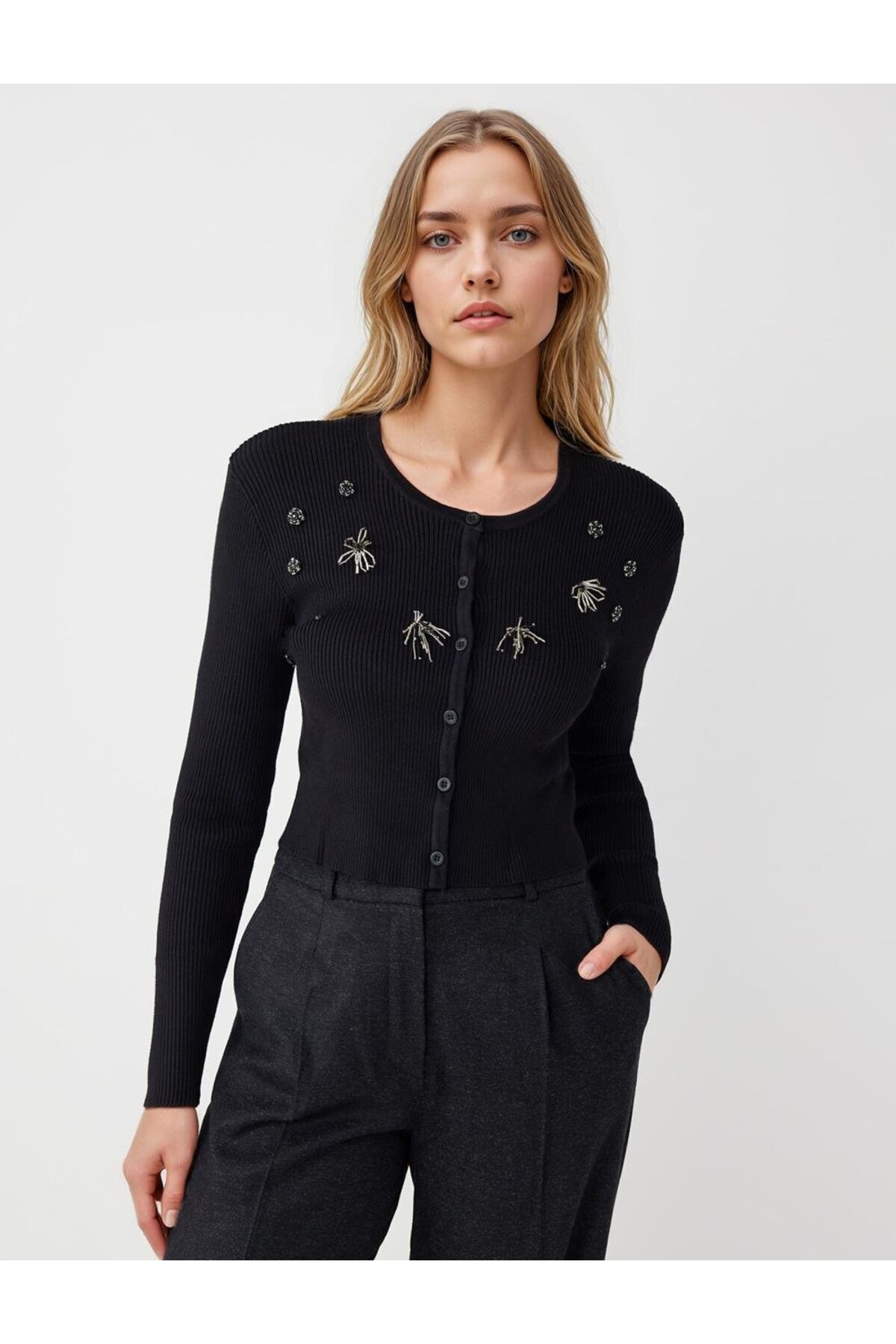 Şerit Pul İşlemeli Düğmeli Siyah Triko Hırka Şerit Pul İşlemeli Düğmeli Siyah Triko Hırka 2425W080800 L
