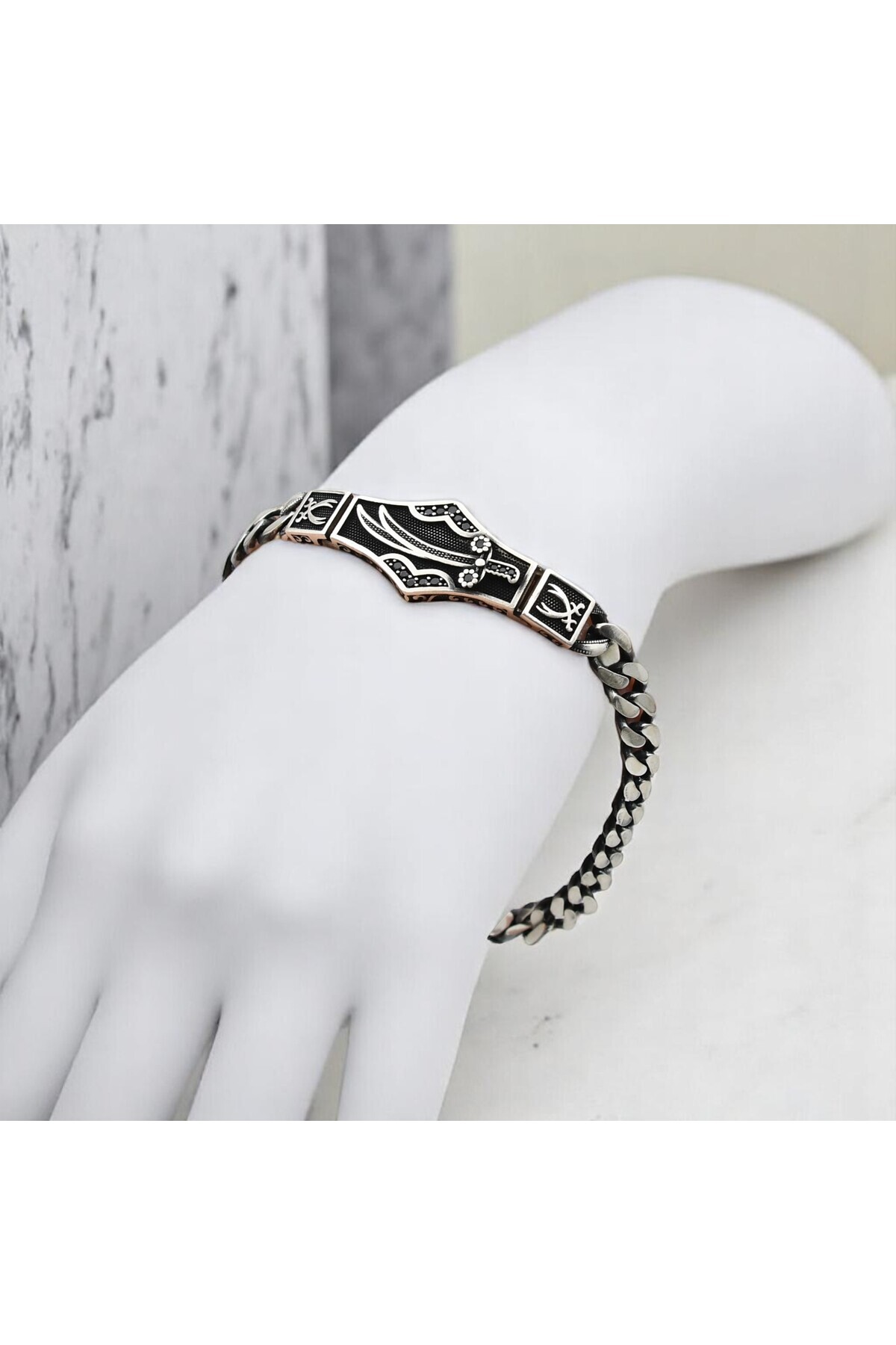 Gurmet Zincir Zirkon Taşlı Zülfikar Kılıç Motifli 925 Ayar Gümüş Erkek Bileklik VEB-5321 Gurmet Zincir Zirkon Taşlı Zülfikar Kılıç Motifli 925 Ayar Gümüş Erkek Bileklik VEB-5321 20 cm