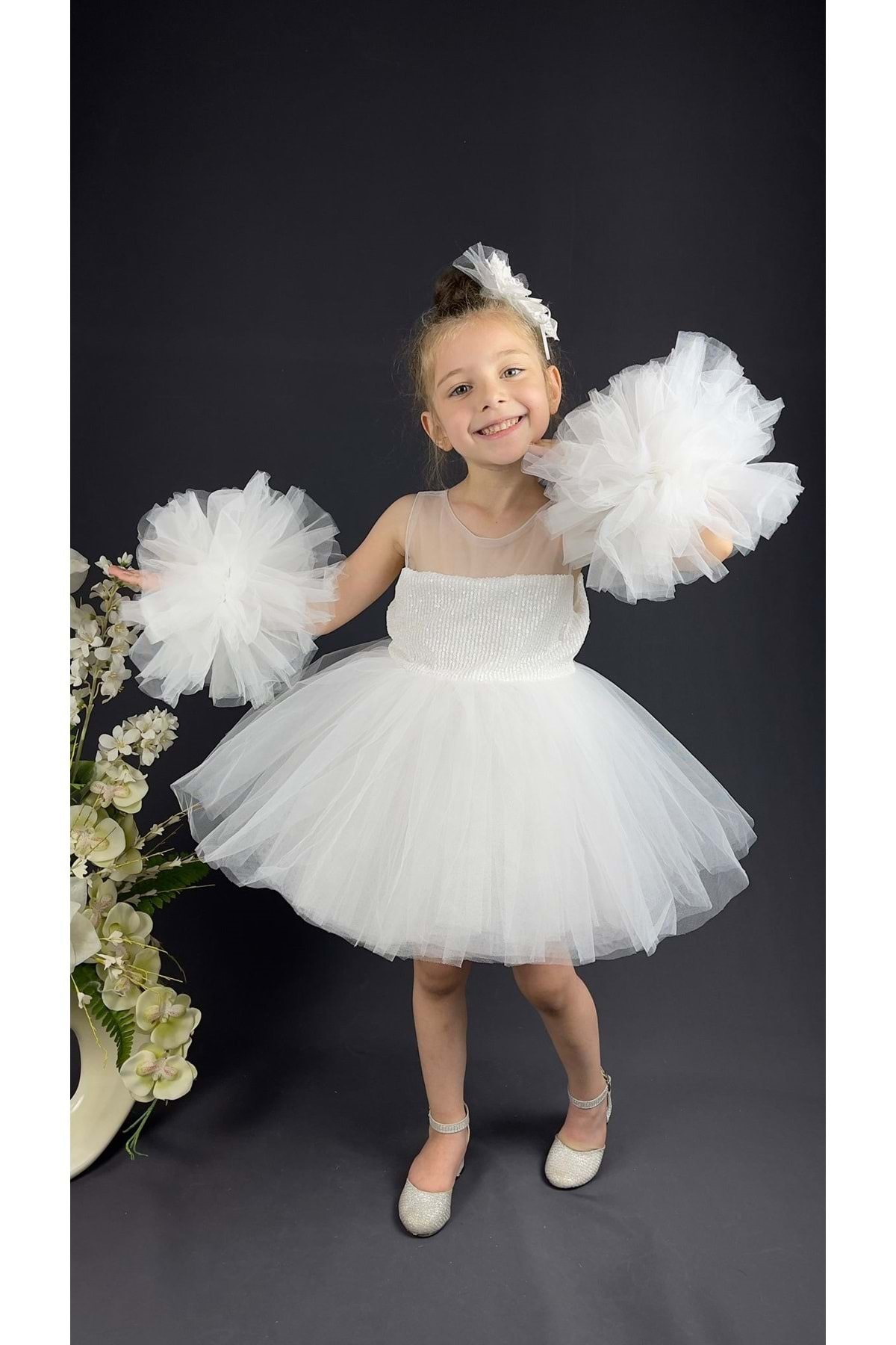 Beyaz Ponpon Kollu Tüllü Kız Çocuk Abiye Parti Elbise Beyaz Ponpon Kollu Tüllü Kız Çocuk Abiye Parti Elbise p1616 12 Yaş