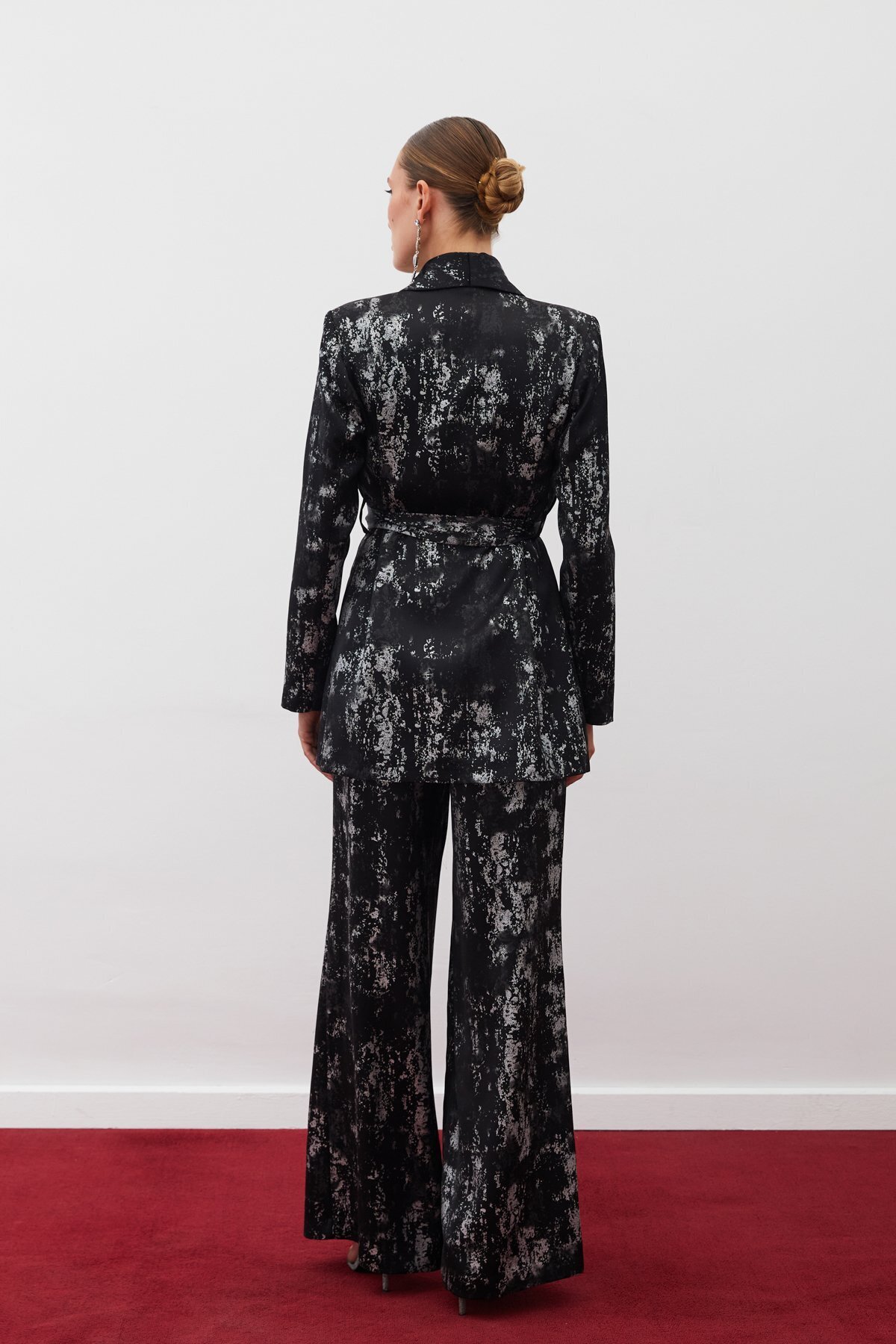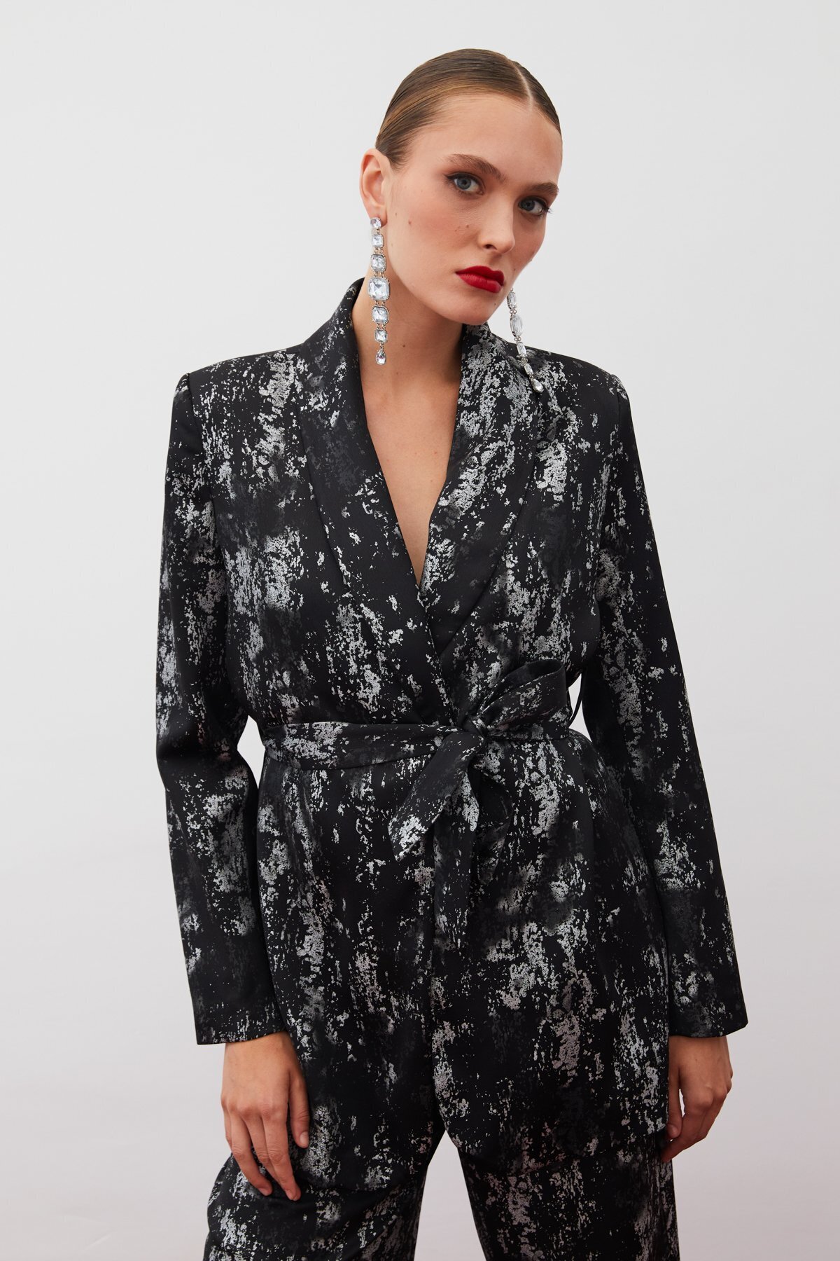 Parlak Desenli Kuşaklı Uzun Ceket - SİYAH-GÜMÜŞ Parlak Desenli Kuşaklı Uzun Ceket - SİYAH-GÜMÜŞ STN139KCE1398 42