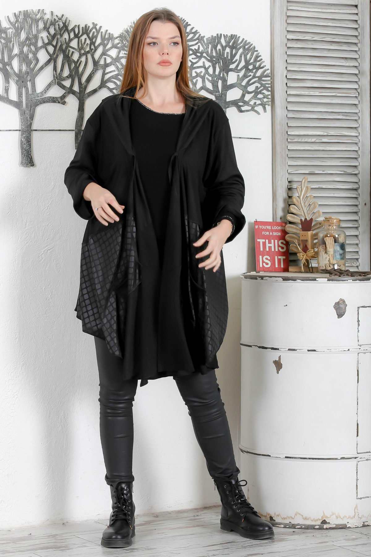 Siyah Kapüşonlu Uzun Kol Bağlamalı Cepli Deri Garnili Casual Asimetrik Oversize Örme Ceket Siyah Kapüşonlu Uzun Kol Bağlamalı Cepli Deri Garnili Casual Asimetrik Oversize Örme Ceket M10210100CE98046 2XL