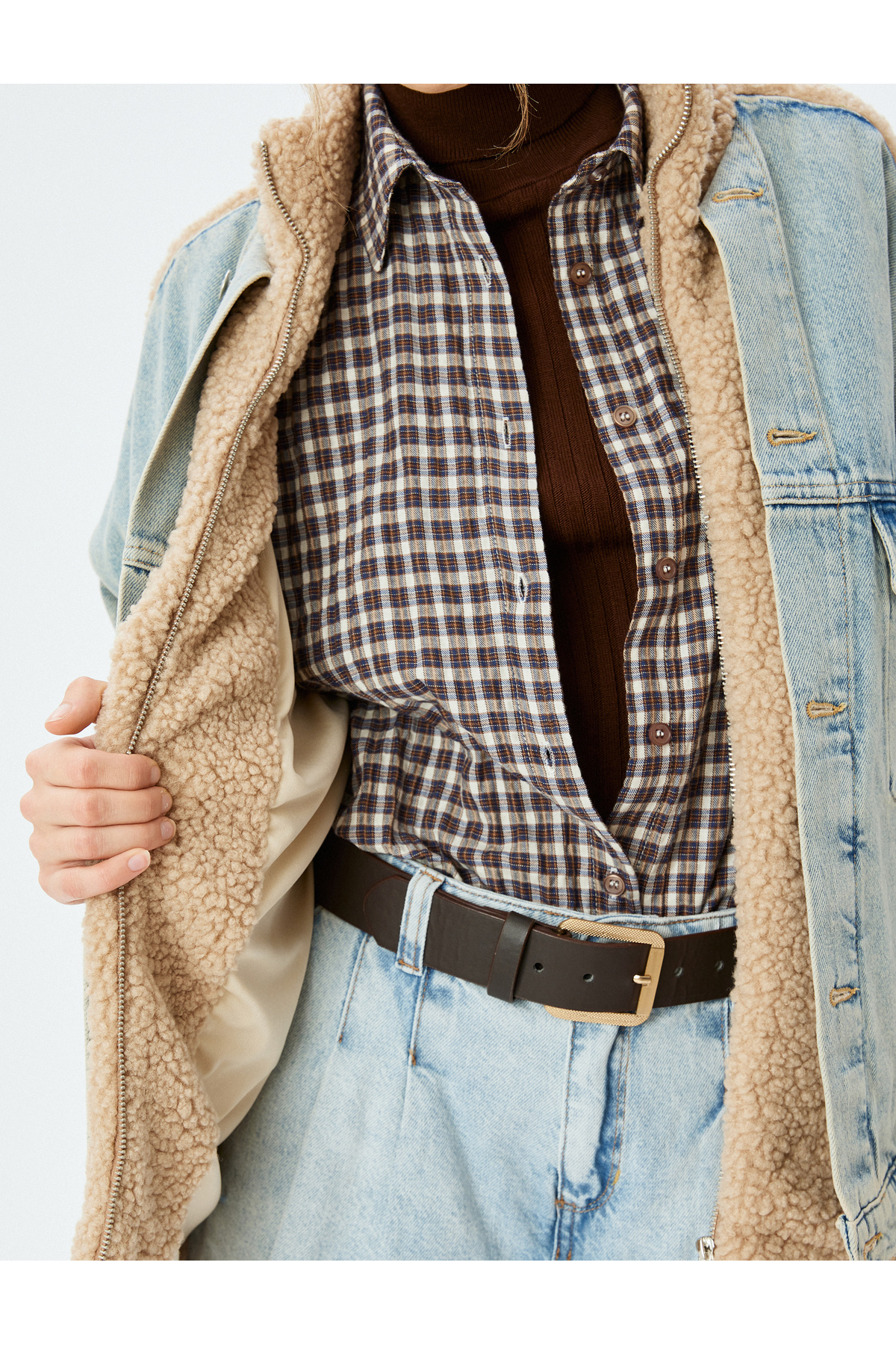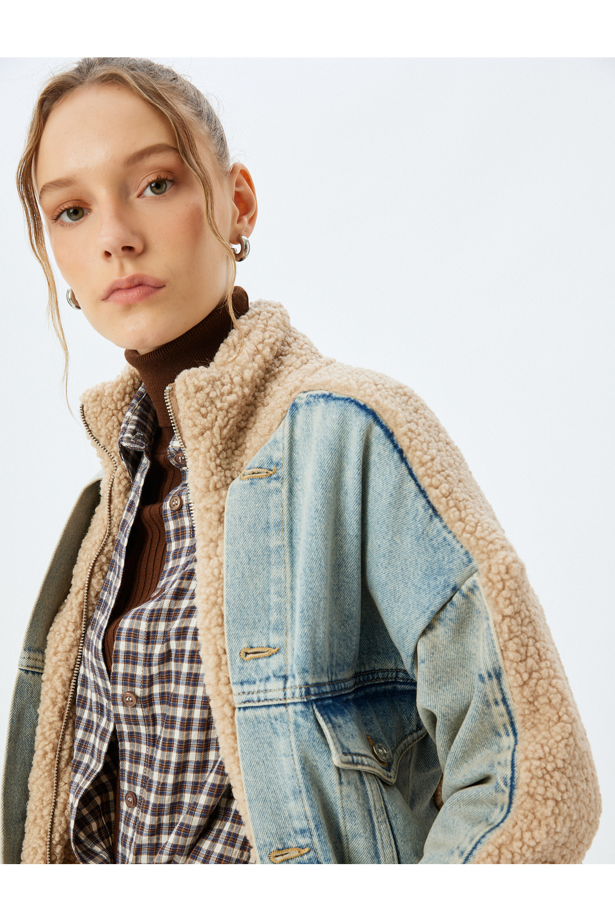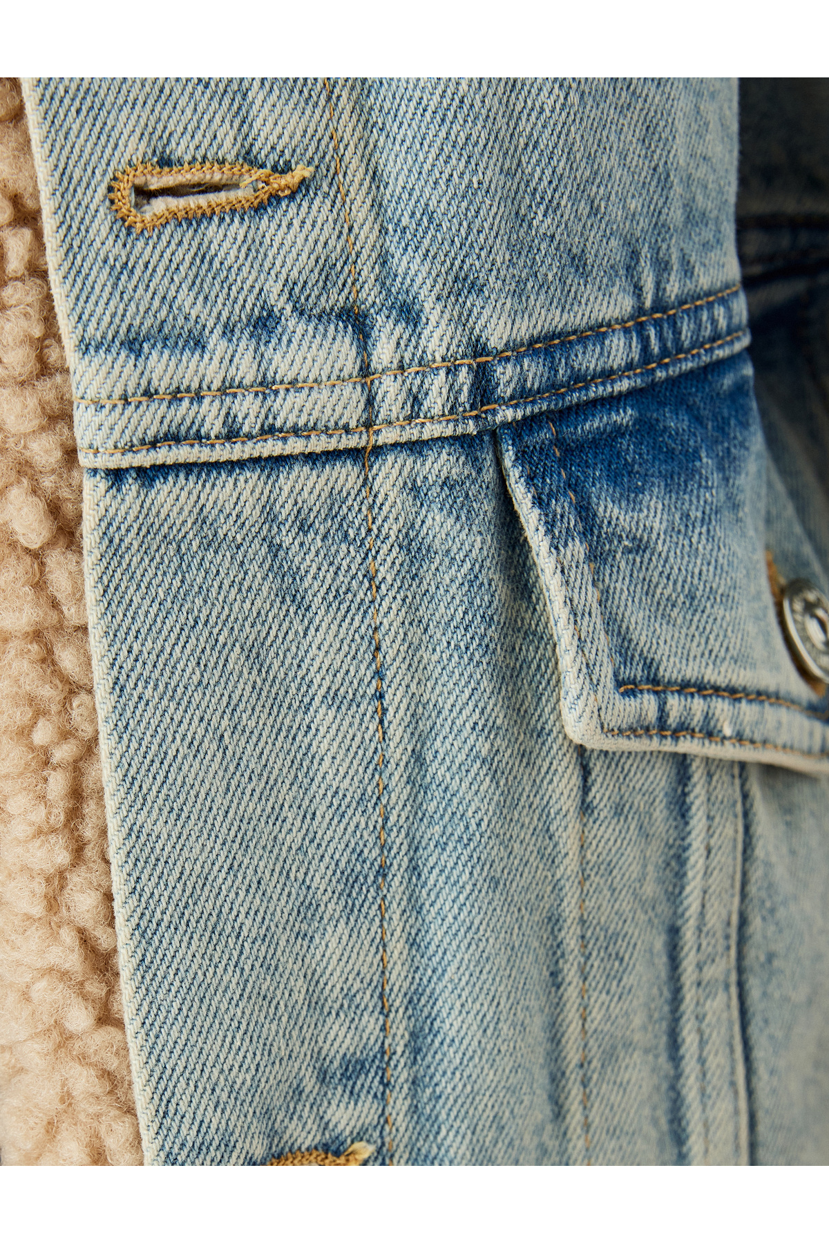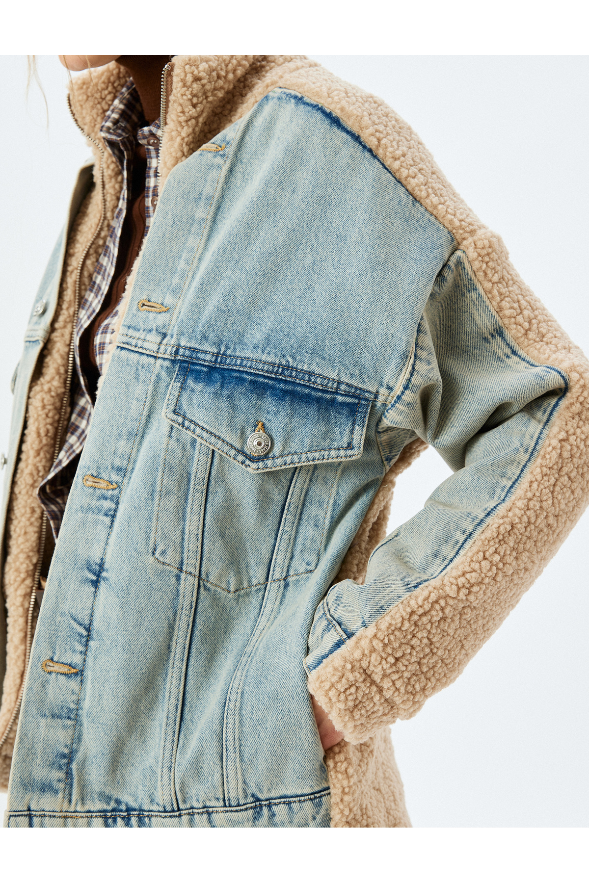 Dik Yaka Düğmeli Cepli Kot Kumaş Detaylı Rahat Kalıp Peluş Ceket Dik Yaka Düğmeli Cepli Kot Kumaş Detaylı Rahat Kalıp Peluş Ceket 5WAL50020MD L