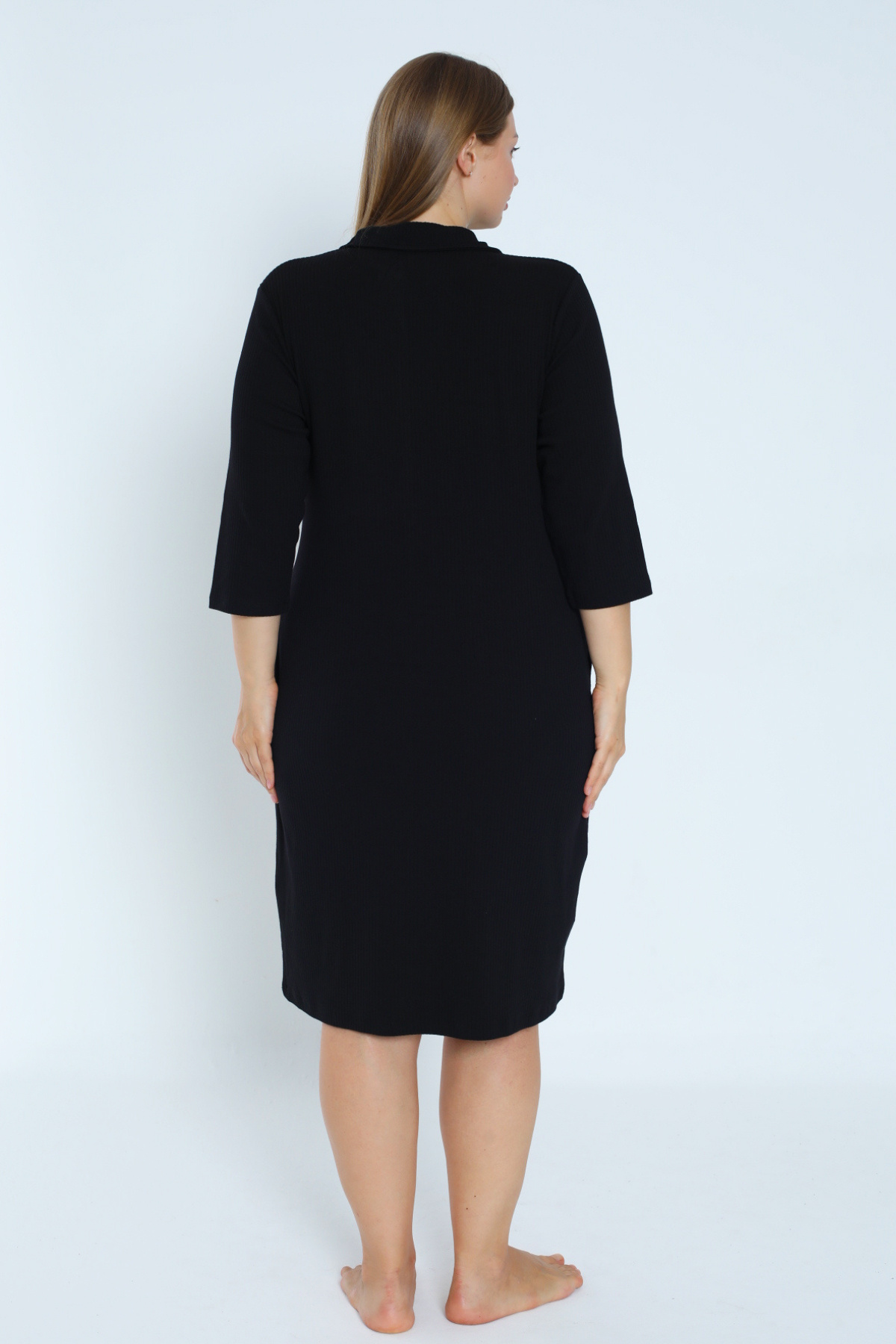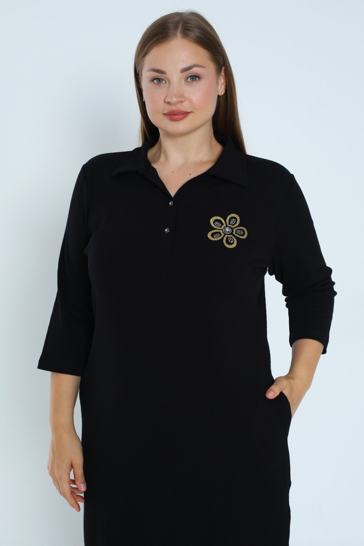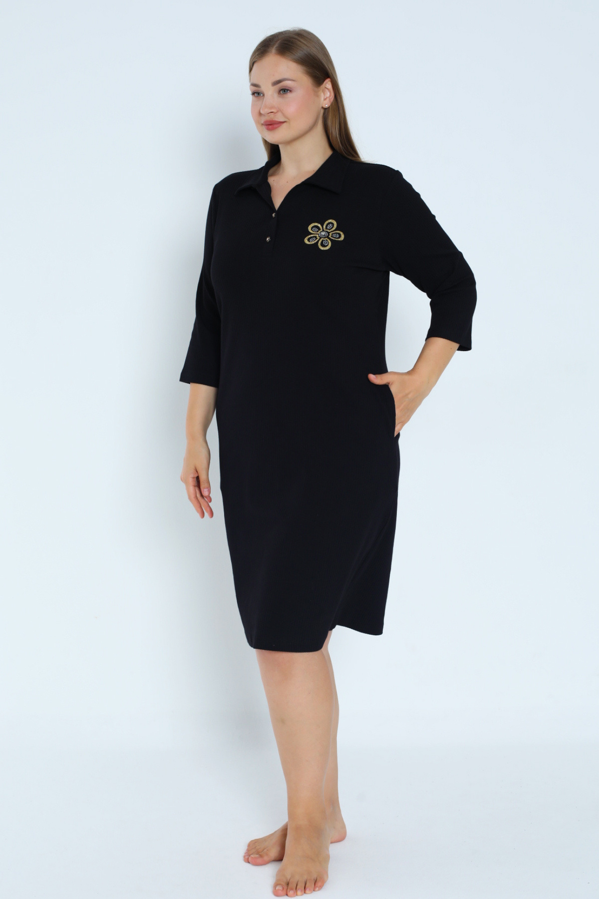 kadın siyah cepli düğmeli taş detaylı pamuklu kaşkörse truvakar kollu büyük beden likralı elbise kadın siyah cepli düğmeli taş detaylı pamuklu kaşkörse truvakar kollu büyük beden likralı elbise 25009 4XL