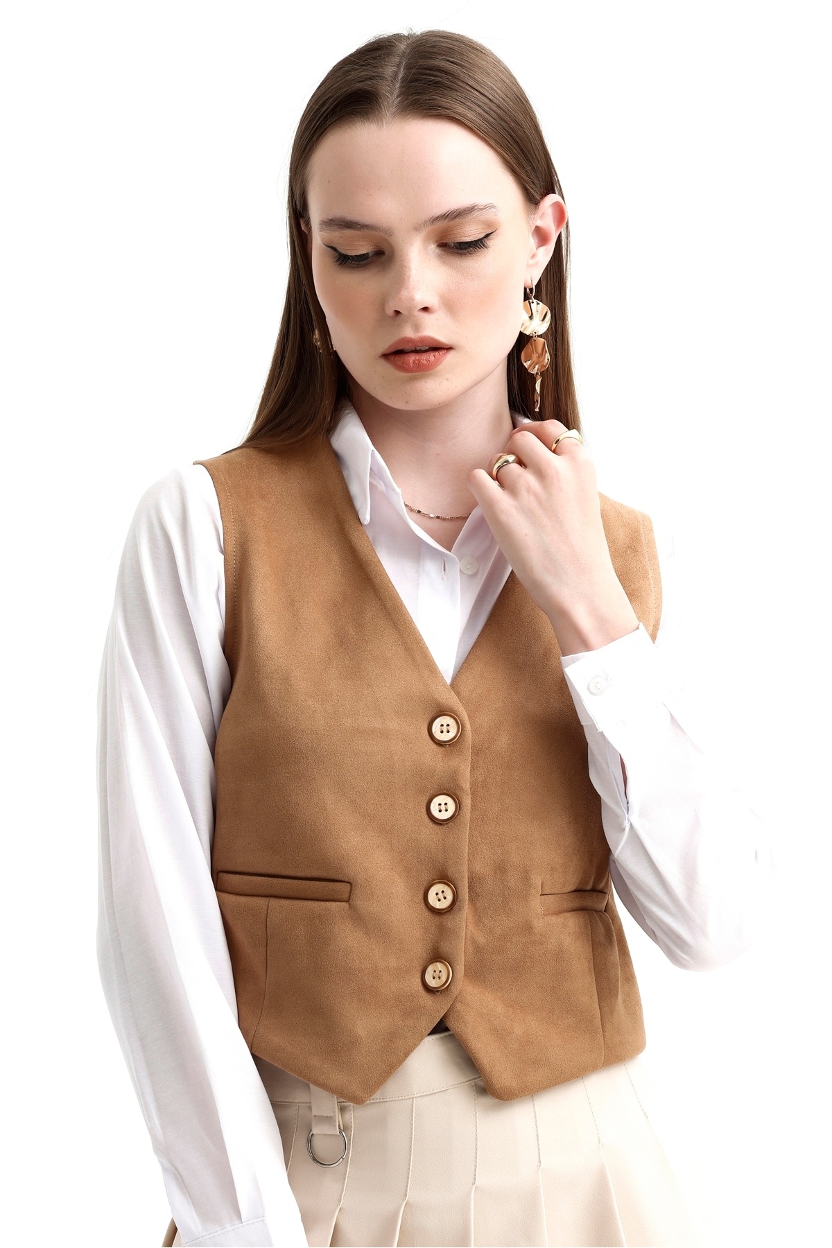 Kadın V Yaka Düğmeli Klasik Süet Yelek Kadın V Yaka Düğmeli Klasik Süet Yelek MDTRN31397 XL
