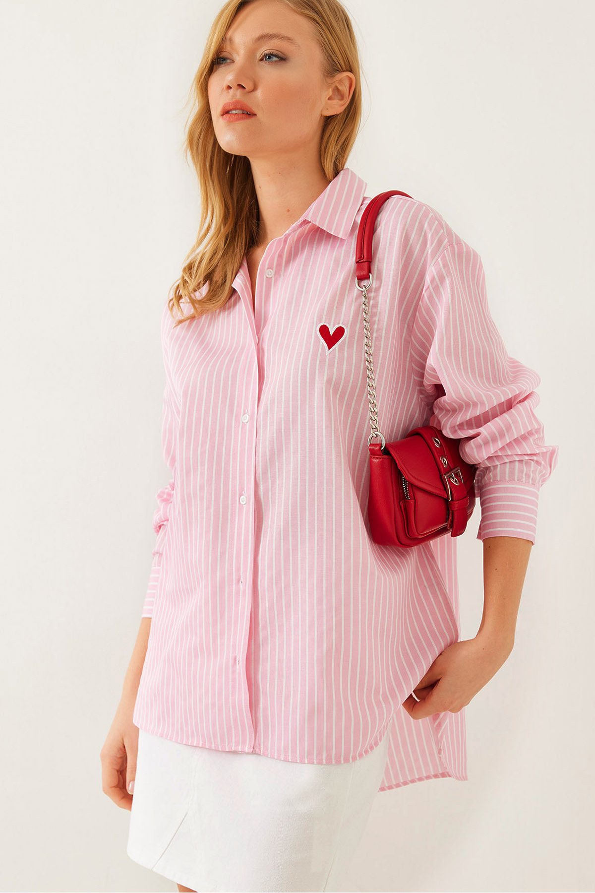 Kadın Çizgili Kalp Detaylı Gömlek Kadın Çizgili Kalp Detaylı Gömlek L