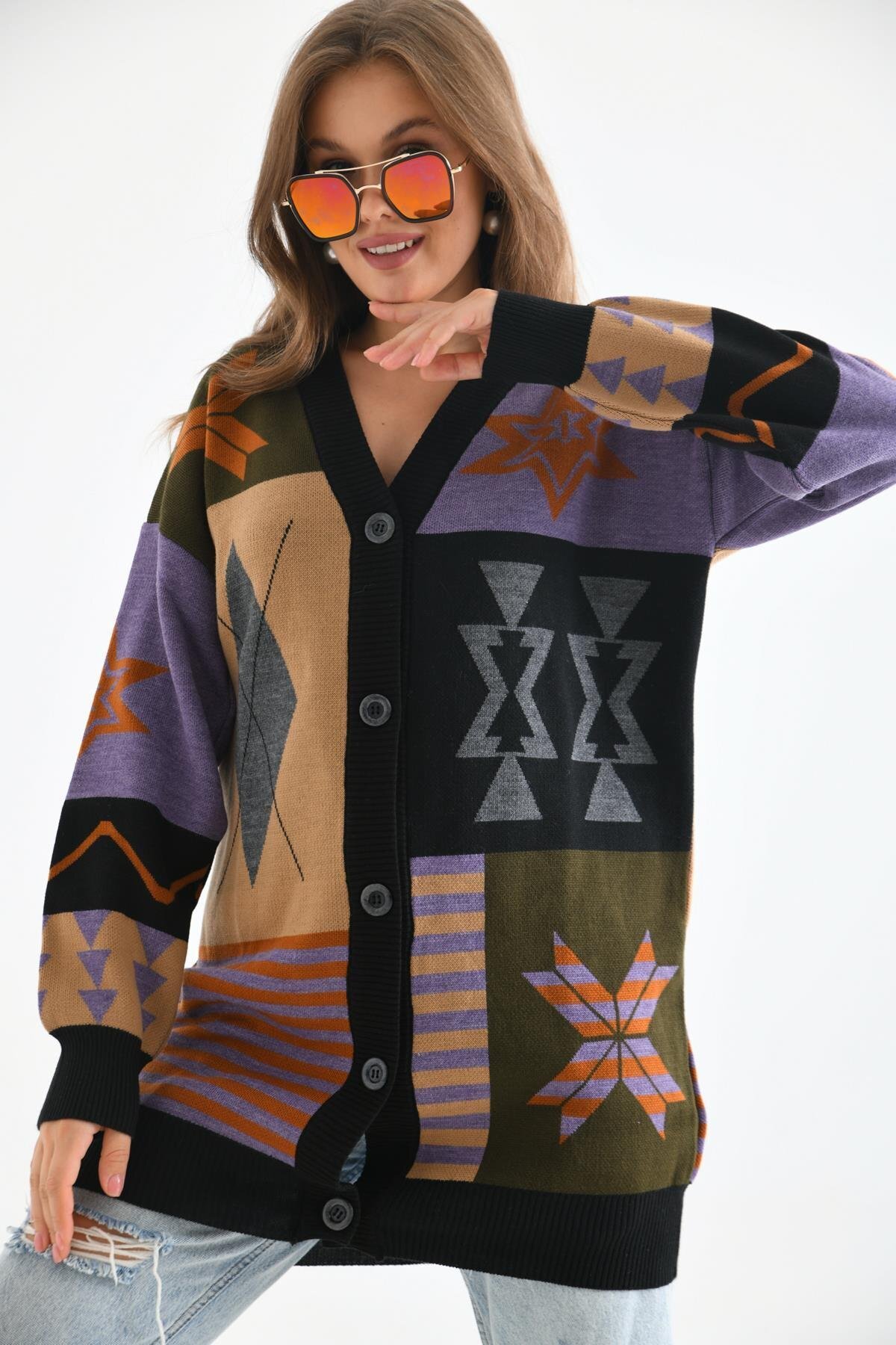 Kadın Siyah Etnik Desenli Oversize Triko Hırka HRK-19000300 Kadın Siyah Etnik Desenli Oversize Triko Hırka HRK-19000300 تک سایز
