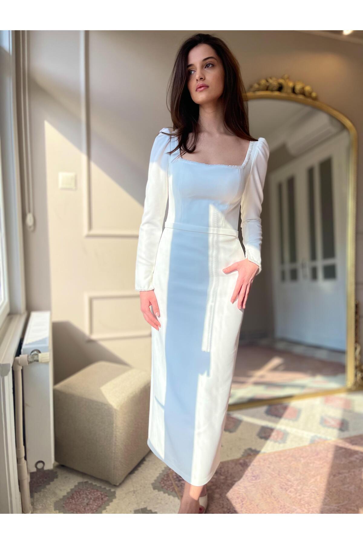 Kristal Taş İşlemeli, Lamine Double Kumaş, Arkadan Yırtmaçlı Kol ve Yaka Detaylı Abiye Elbise Kristal Taş İşlemeli, Lamine Double Kumaş, Arkadan Yırtmaçlı Kol ve Yaka Detaylı Abiye Elbise SER3002 42