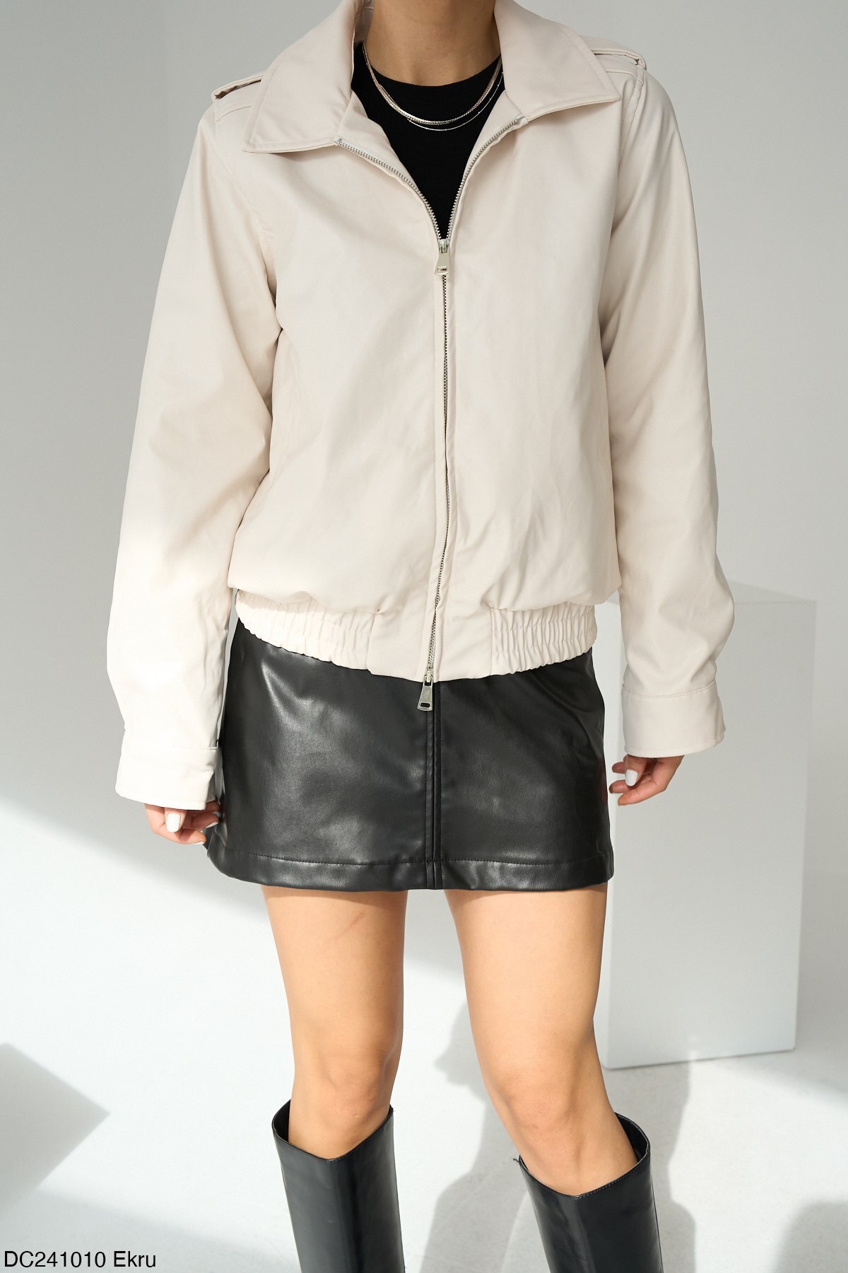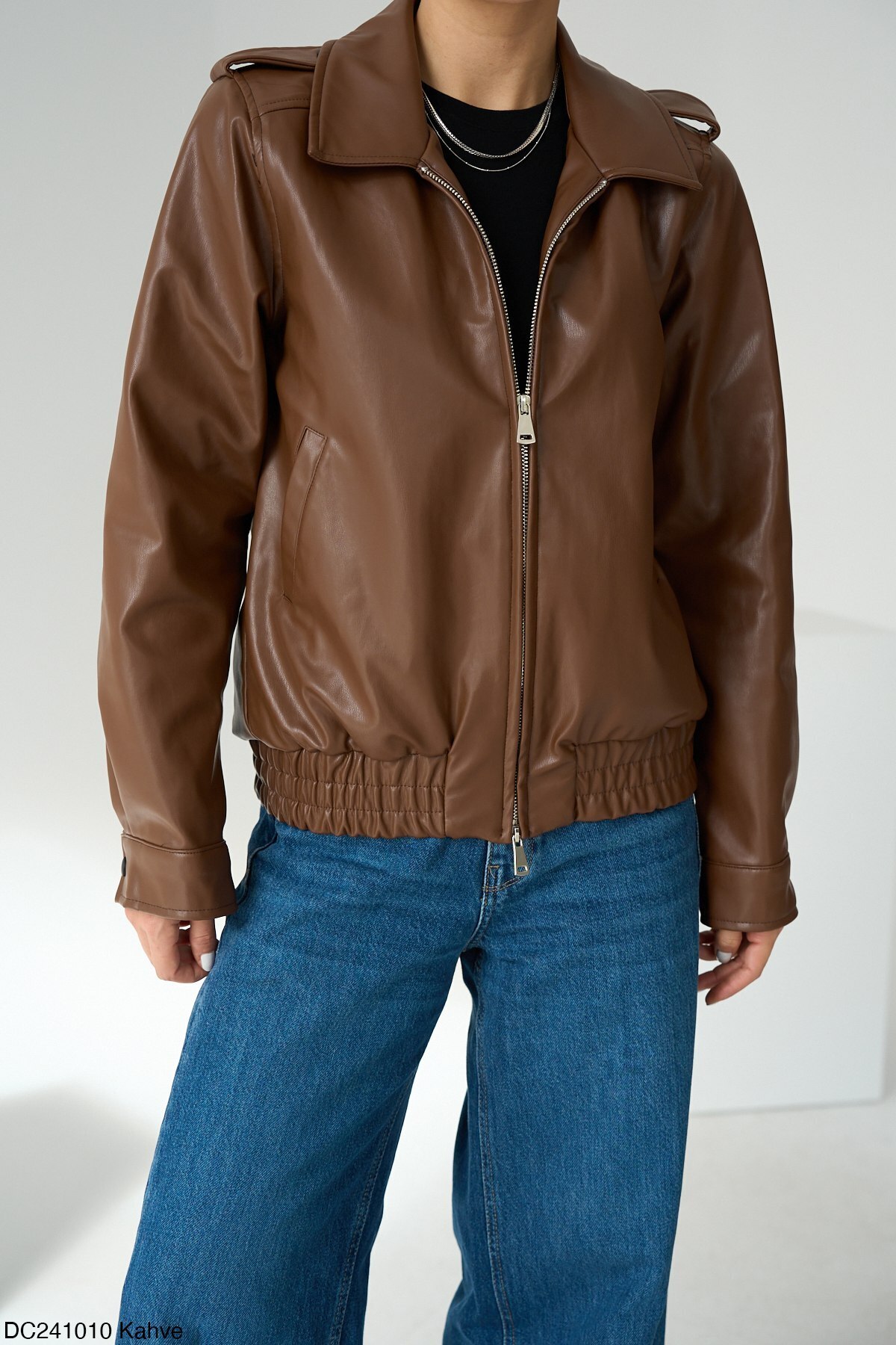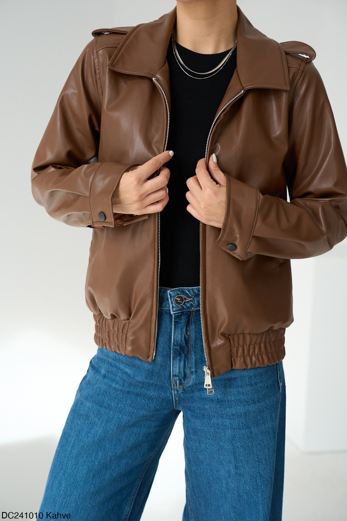 Kadın Kahve Fermuarlı Vegan Deri Ceket Kadın Kahve Fermuarlı Vegan Deri Ceket DC241010 L