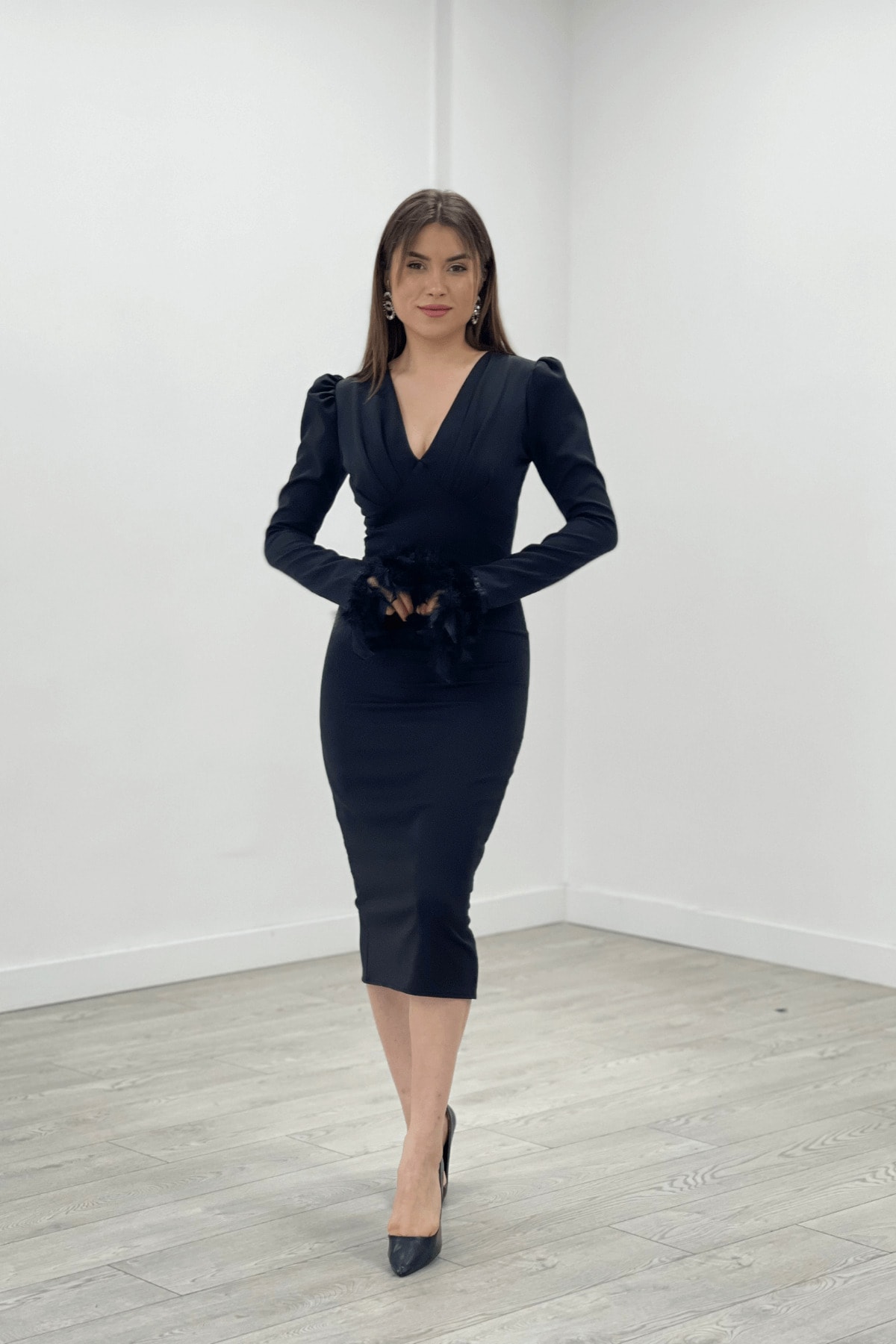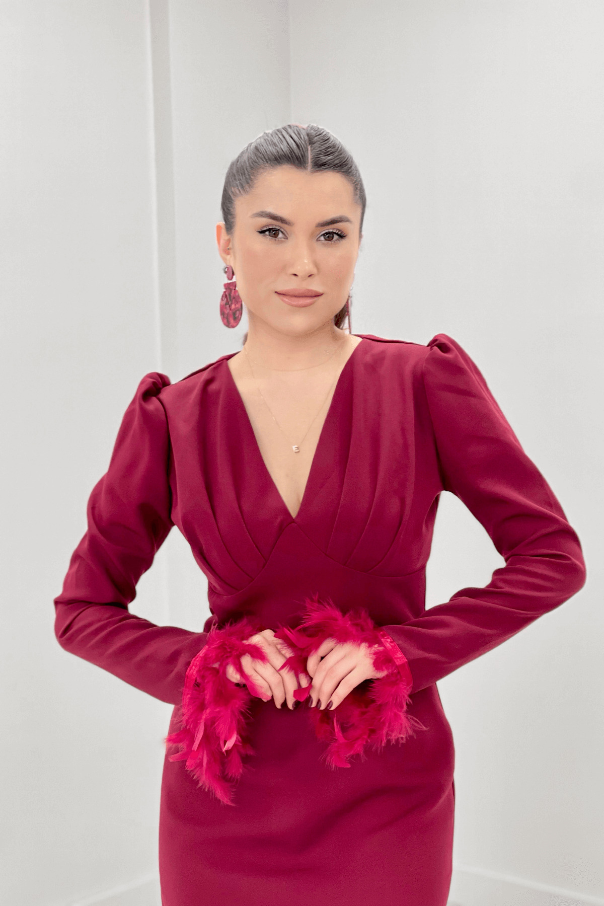 Double Kumaş V Yaka Kolları Tüy Detaylı Kalem Abiye Elbise - BORDO Double Kumaş V Yaka Kolları Tüy Detaylı Kalem Abiye Elbise - BORDO GYM-0937 50