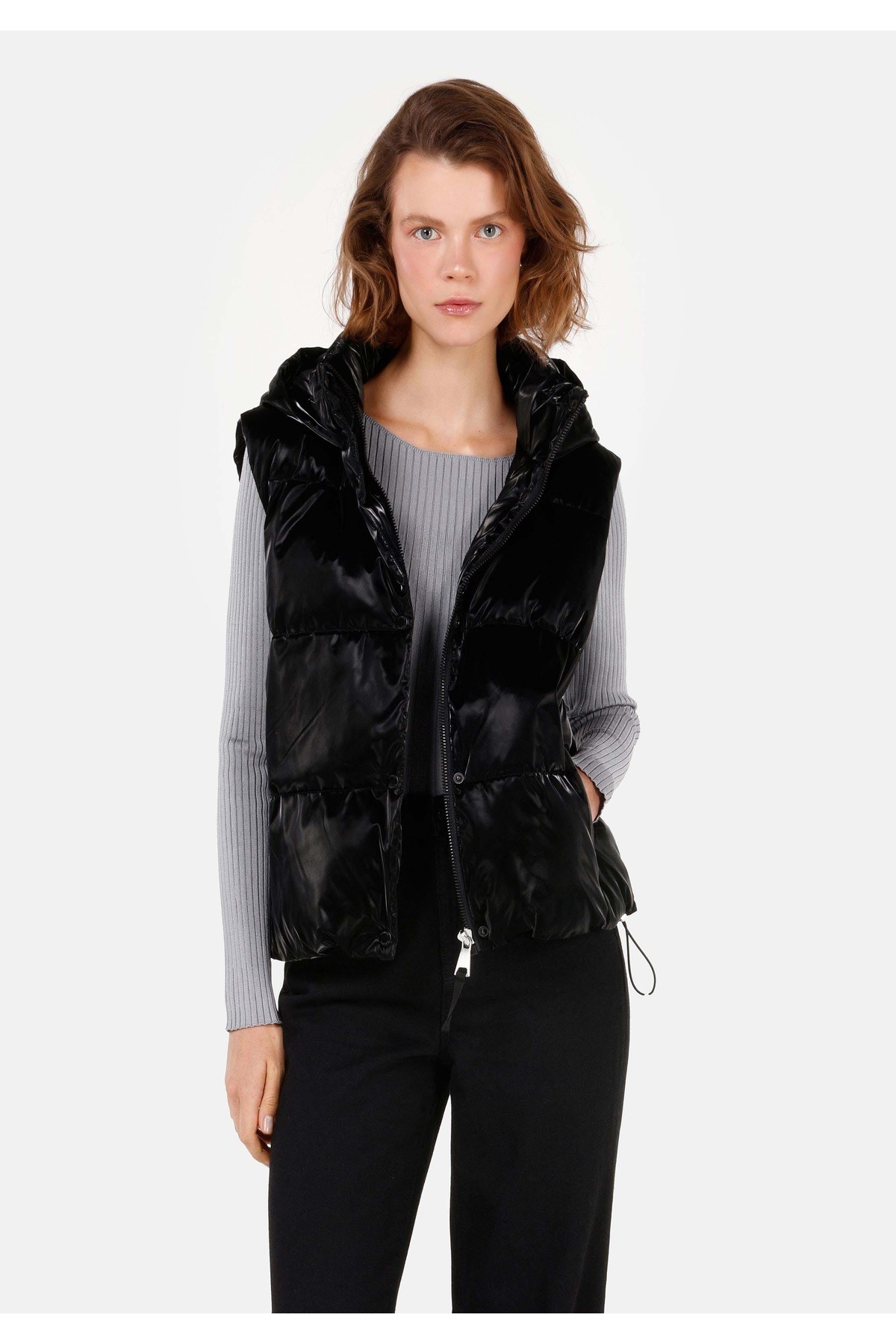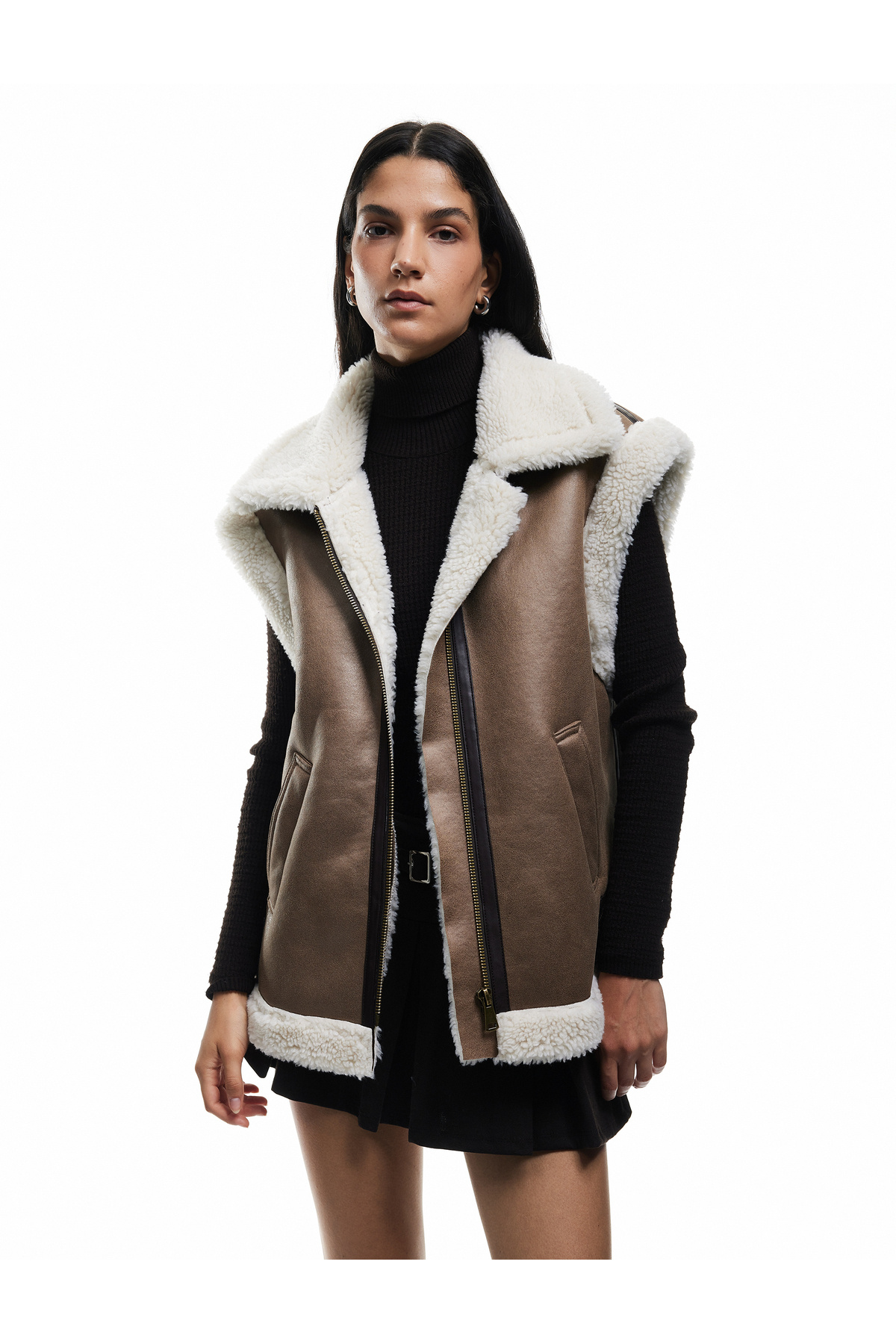 Deri Görünümlü Şişme Yelek Peluş Detaylı Renk Bloklu Fermuarlı Cepli Deri Görünümlü Şişme Yelek Peluş Detaylı Renk Bloklu Fermuarlı Cepli 5WAL20072IW 42