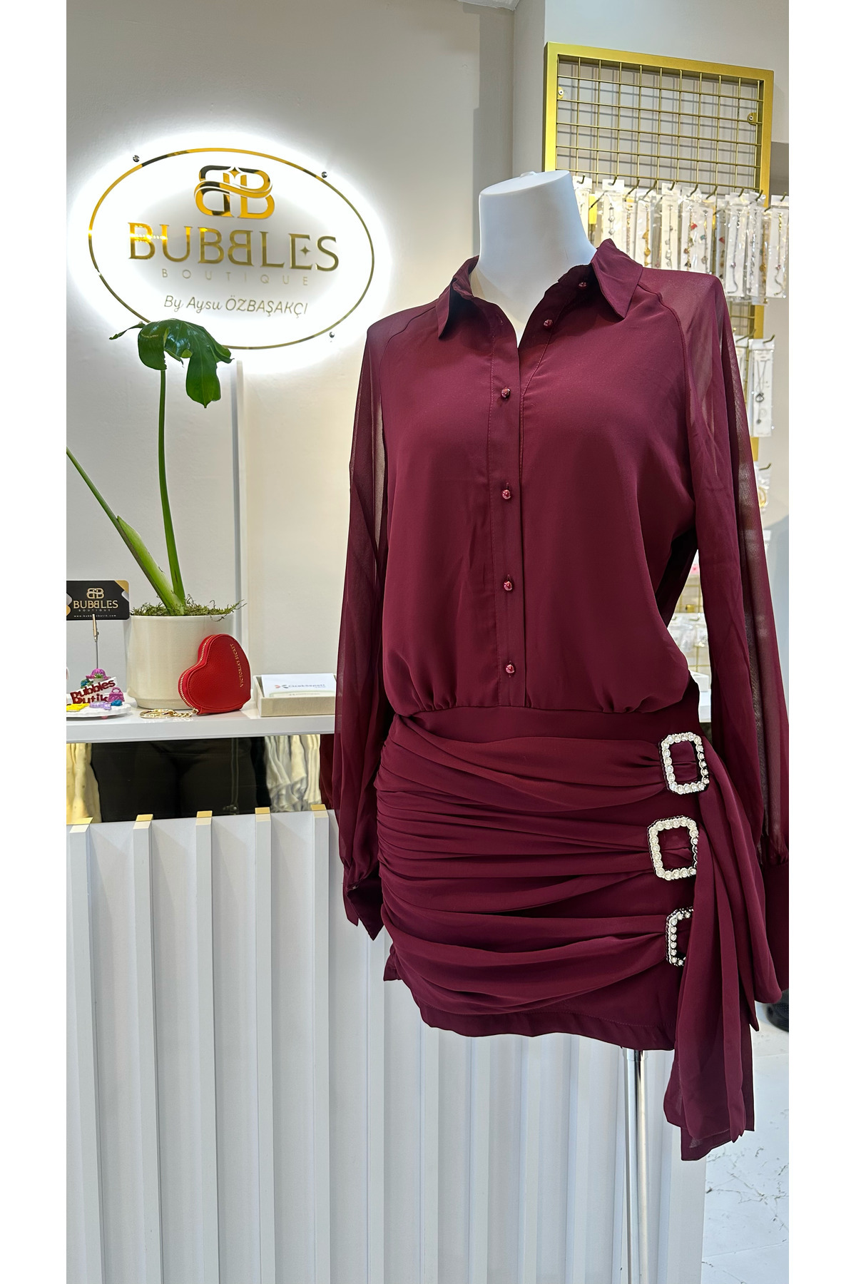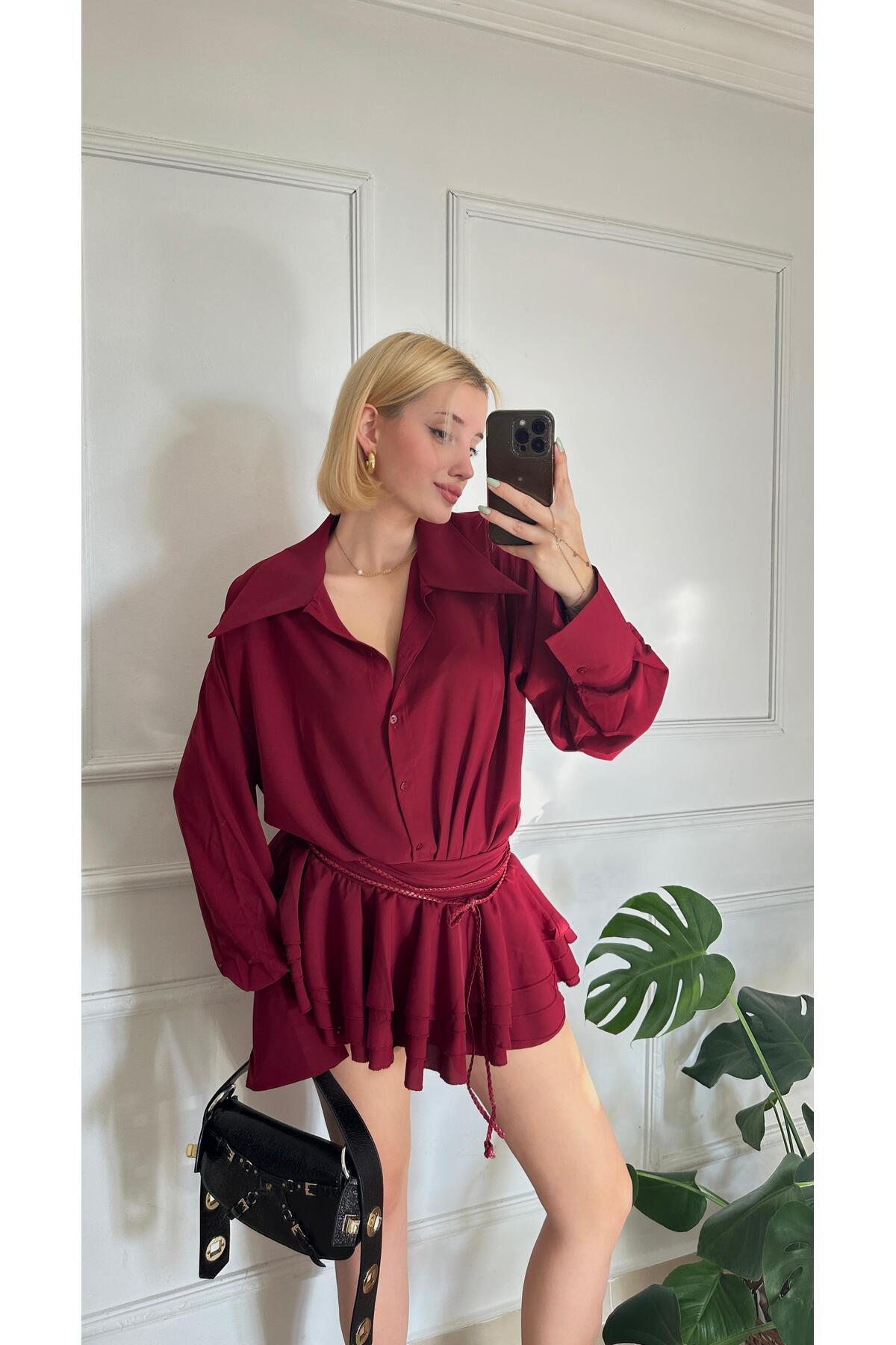 Jessica Bordo Tasarım Dökümlü Kumaş Kemerli Gömlek Elbise Jessica Bordo Tasarım Dökümlü Kumaş Kemerli Gömlek Elbise Fİ-09482 L