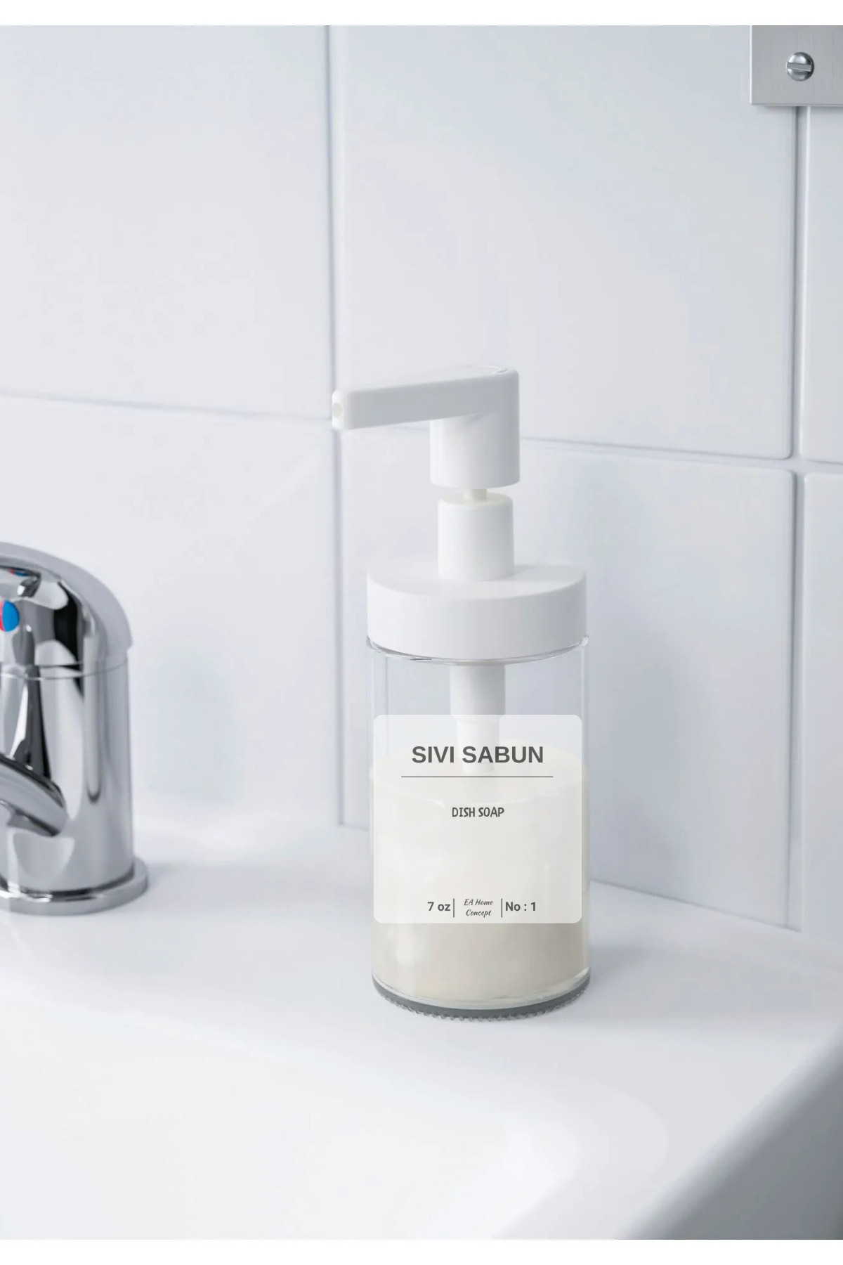 Tackan Cam Sıvı Sabun Etiketli Cam Şişe 200 ml Beyaz Renk Tackan Cam Sıvı Sabun Etiketli Cam Şişe 200 ml Beyaz Renk EA235 تک سایز