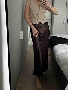 Kadın Kahverengi Parlak Saten Çan Etek Likralı Beli Lastikli Maxi Boy Kadın Kahverengi Parlak Saten Çan Etek Likralı Beli Lastikli Maxi Boy ŞAEYP0003 2XL