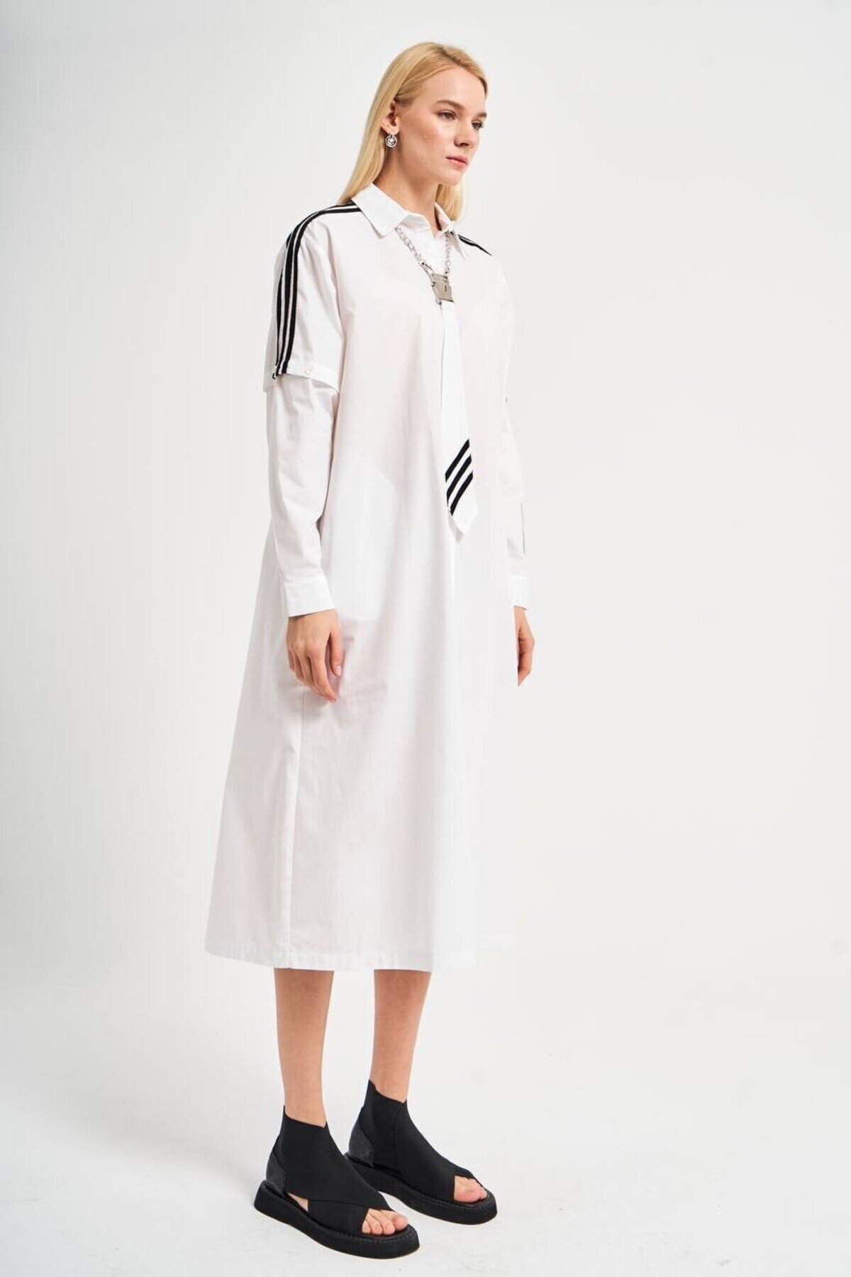 Şerit Detaylı Kıravatlı Uzun Gömlek Elbise Şerit Detaylı Kıravatlı Uzun Gömlek Elbise TW3-457 L