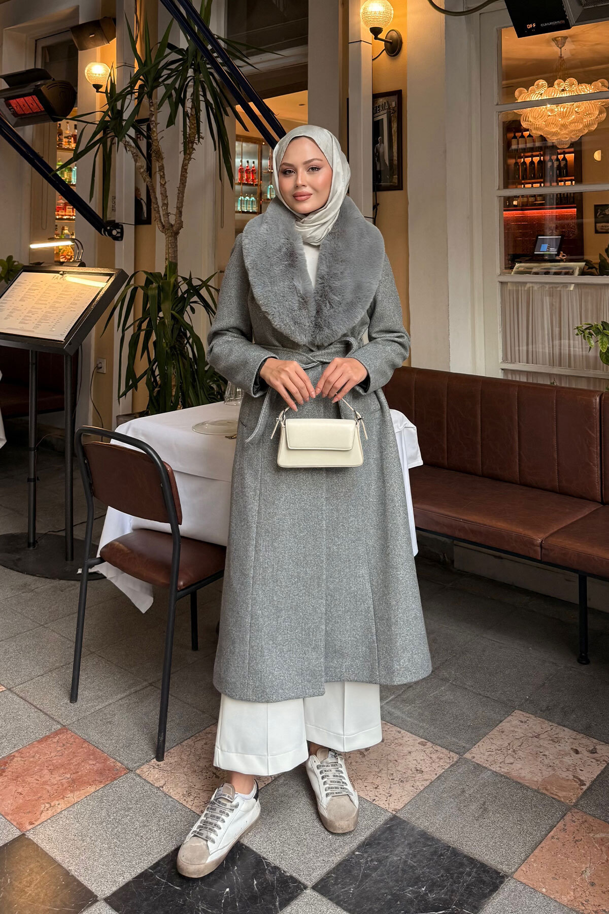 Kadın Kürk Yaka Detay Midi Boy Kruvaze Kaban Gri Kadın Kürk Yaka Detay Midi Boy Kruvaze Kaban Gri 270-3121 48