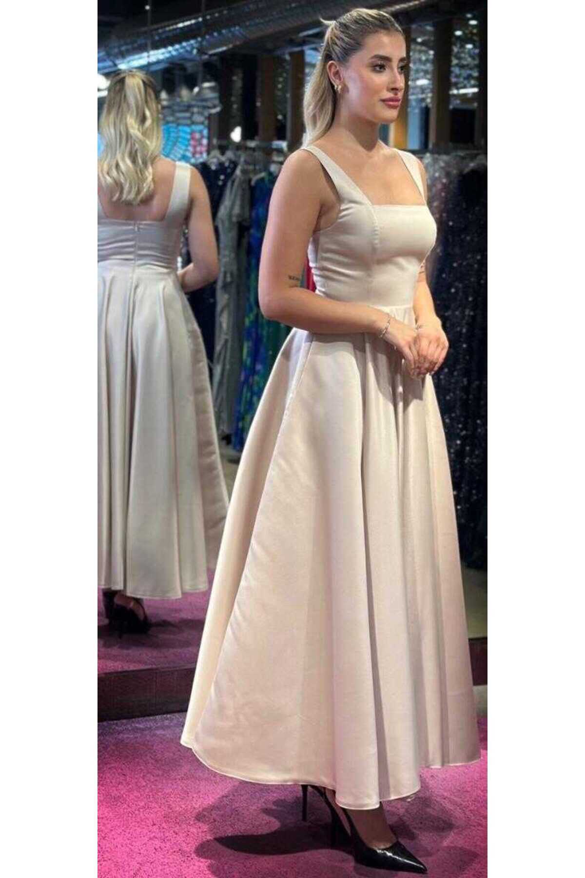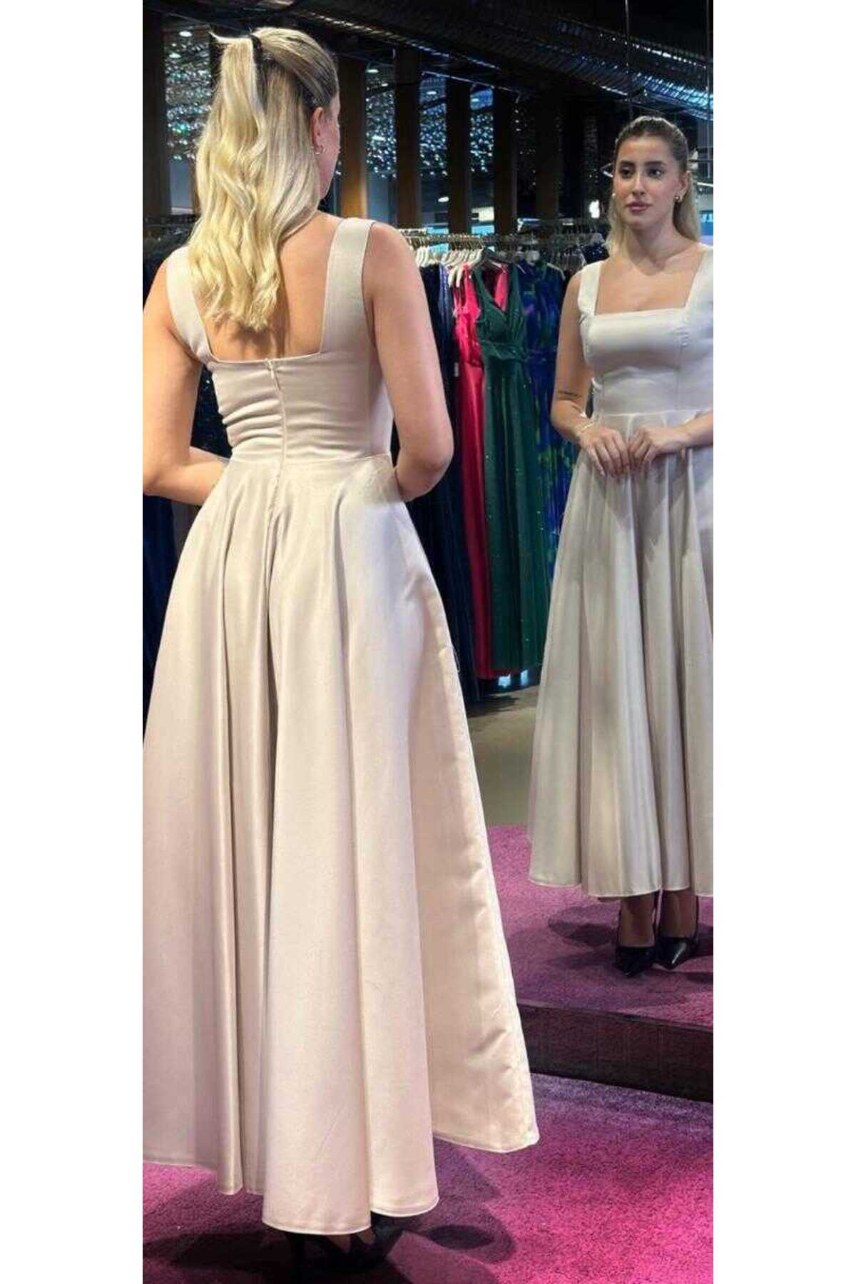 Bej Kalın Askı Kloş Etekli Saten Midi Abiye Elbise 7631 Bej Kalın Askı Kloş Etekli Saten Midi Abiye Elbise 7631 50