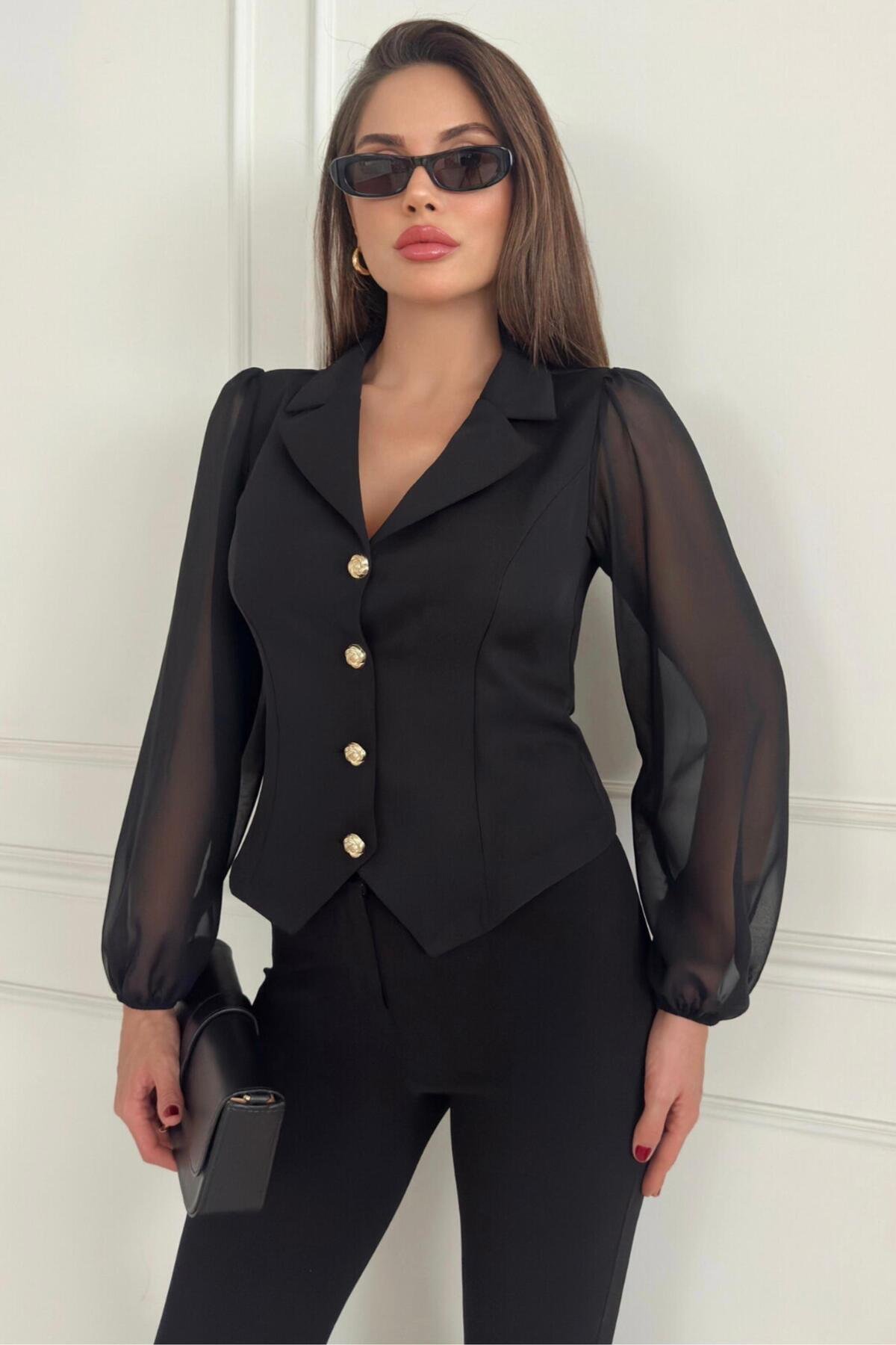 Ceket Yaka Kolları Şifon Gold Düğme Detaylı Kadın Ceket 026 Ceket Yaka Kolları Şifon Gold Düğme Detaylı Kadın Ceket 026 ZSH-STP-026 XL
