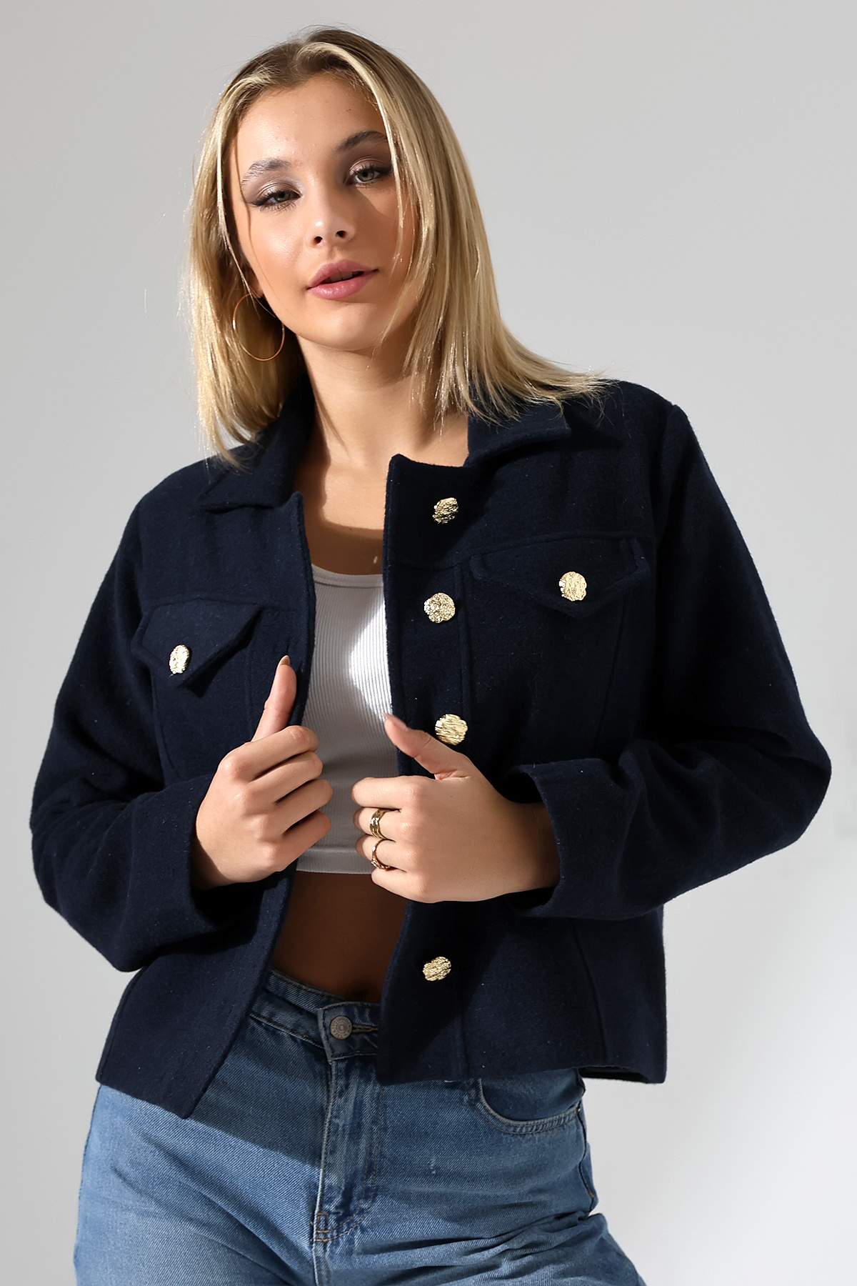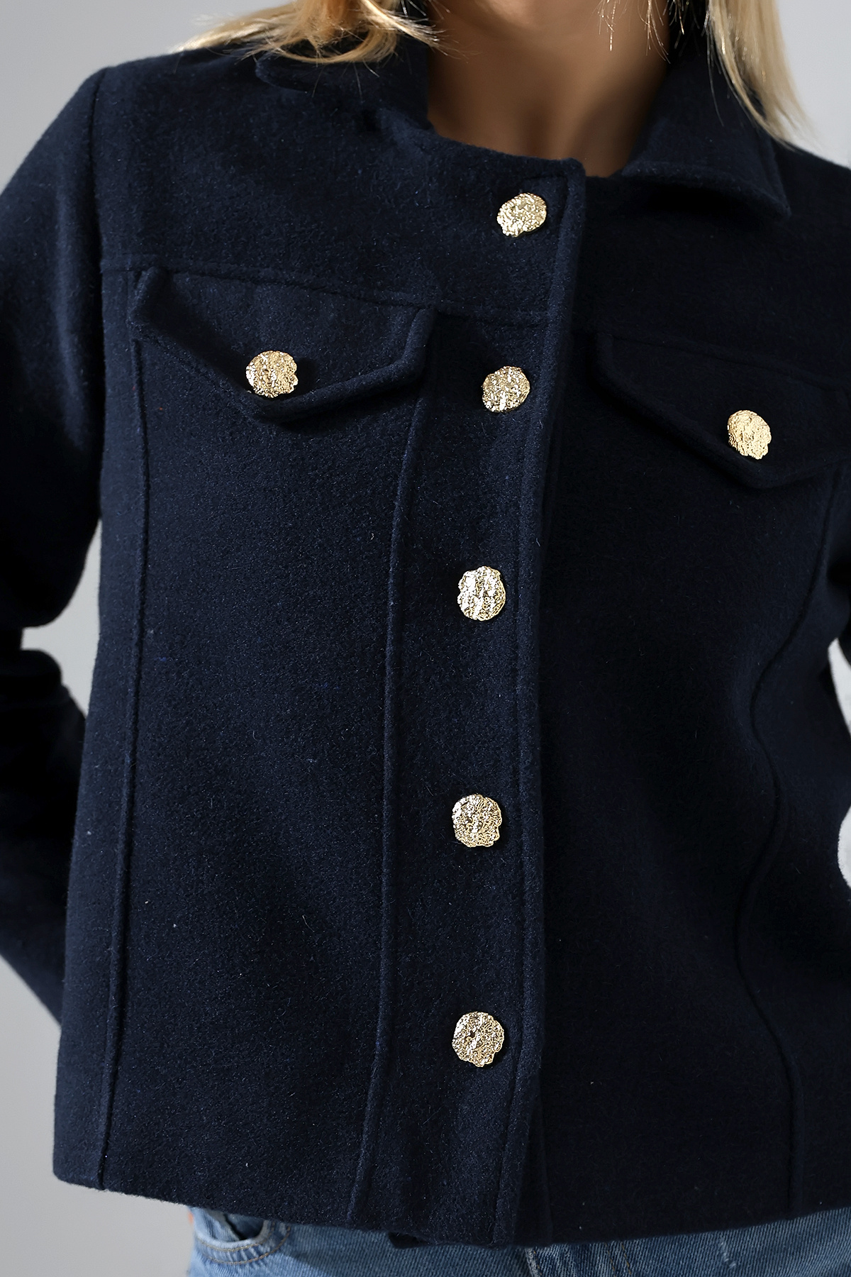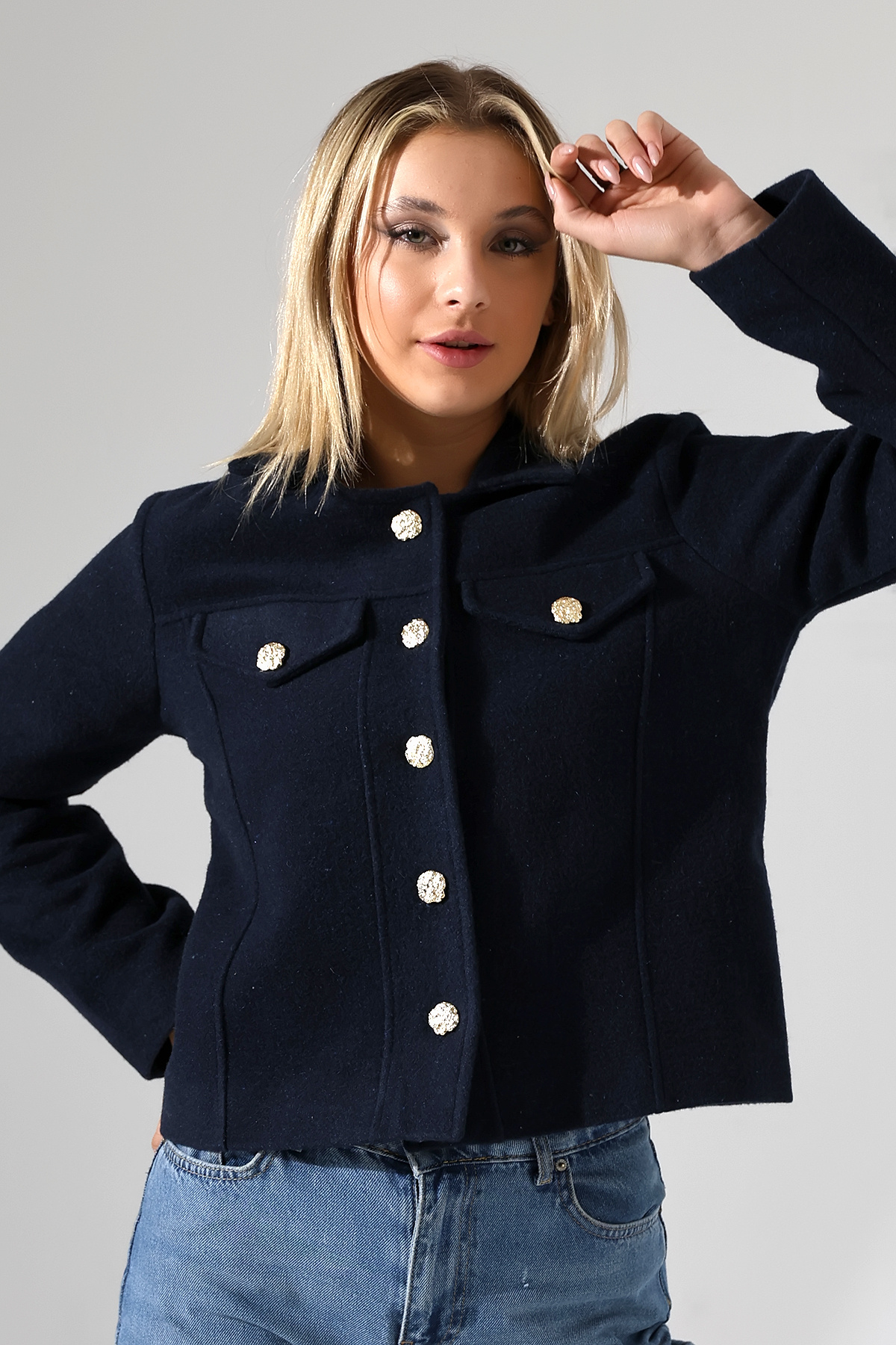 Düğmeli Lacivert Kadın Kısa Kaşe Ceket Düğmeli Lacivert Kadın Kısa Kaşe Ceket UJ1025 XL
